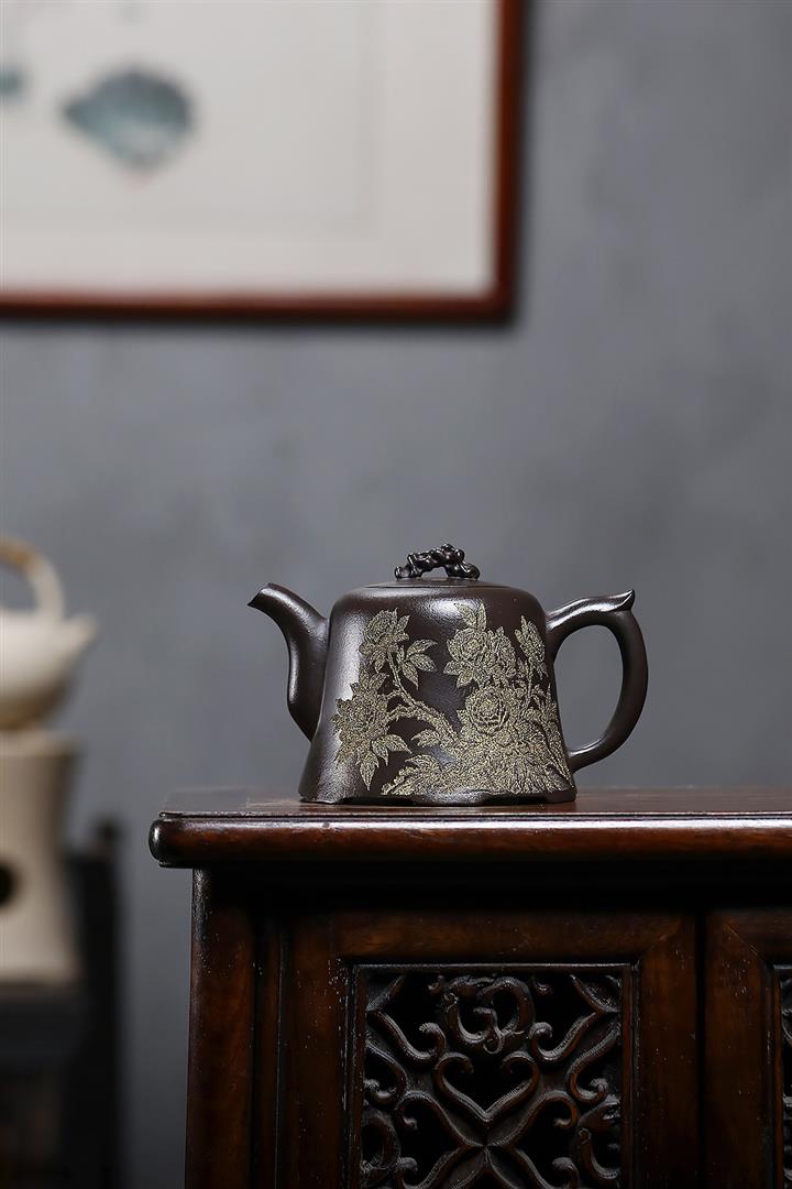 原礦紫泥刻繪金鱗魚罩茶壺POT7027