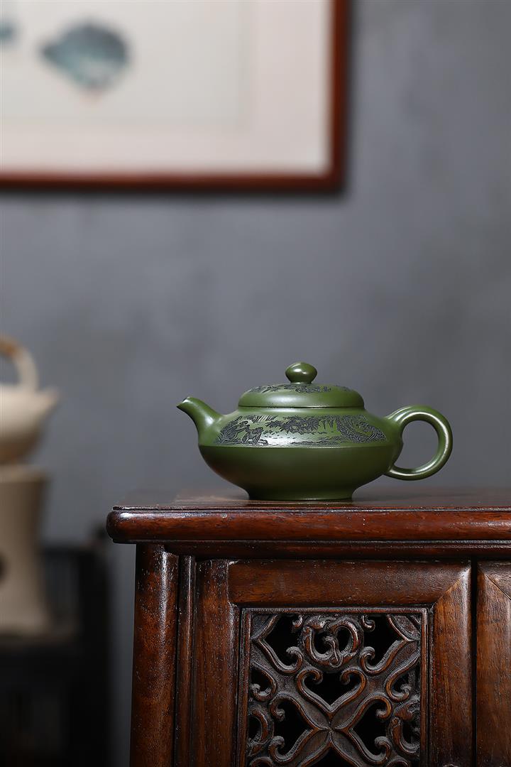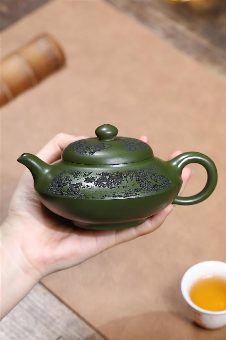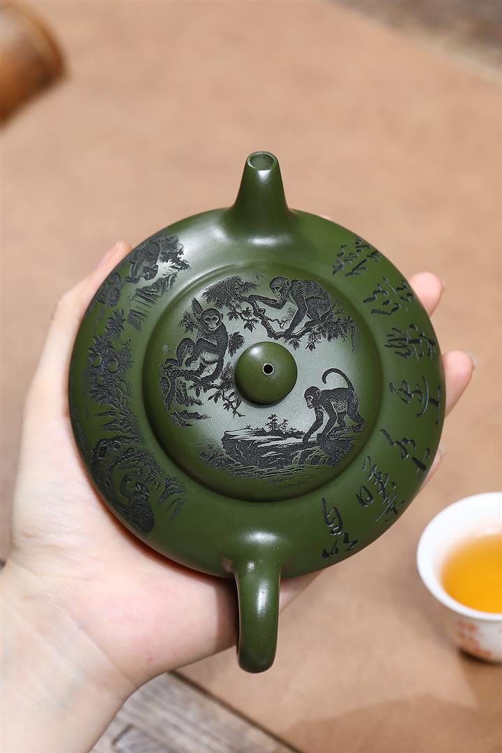原礦綠泥刻繪猿猴合歡茶壺POT7033