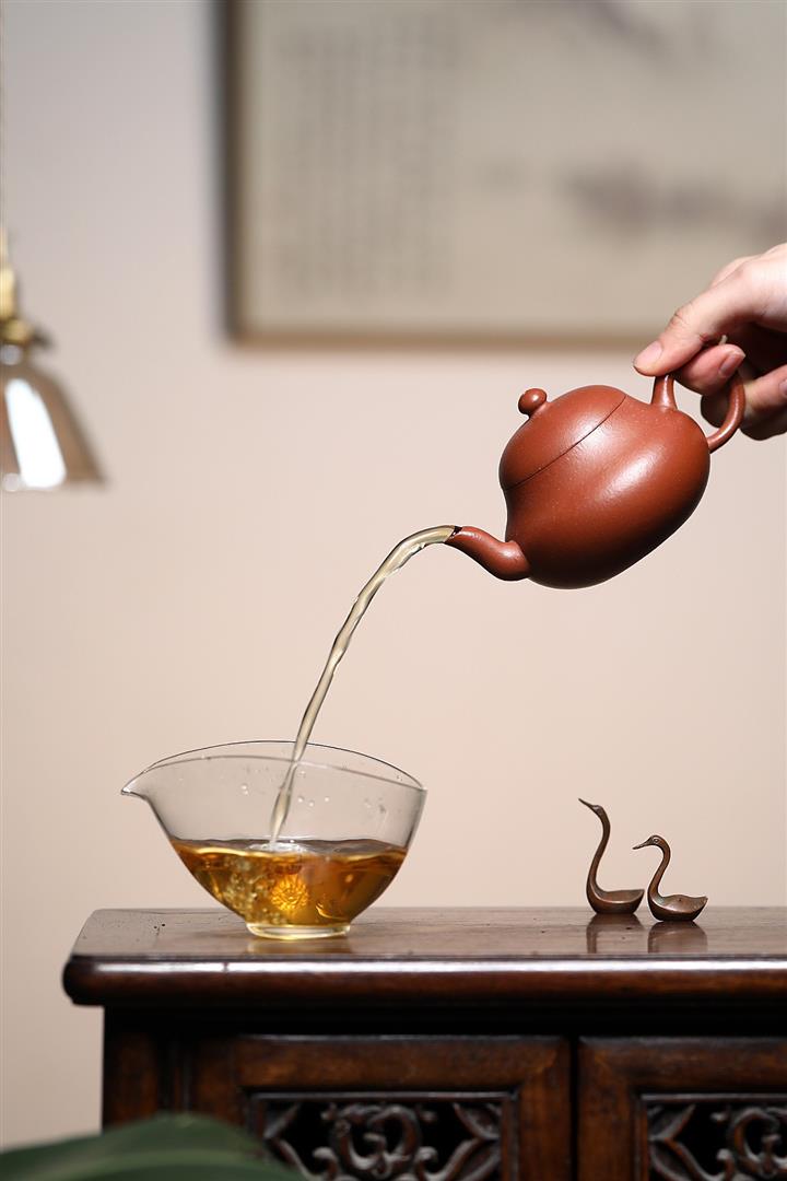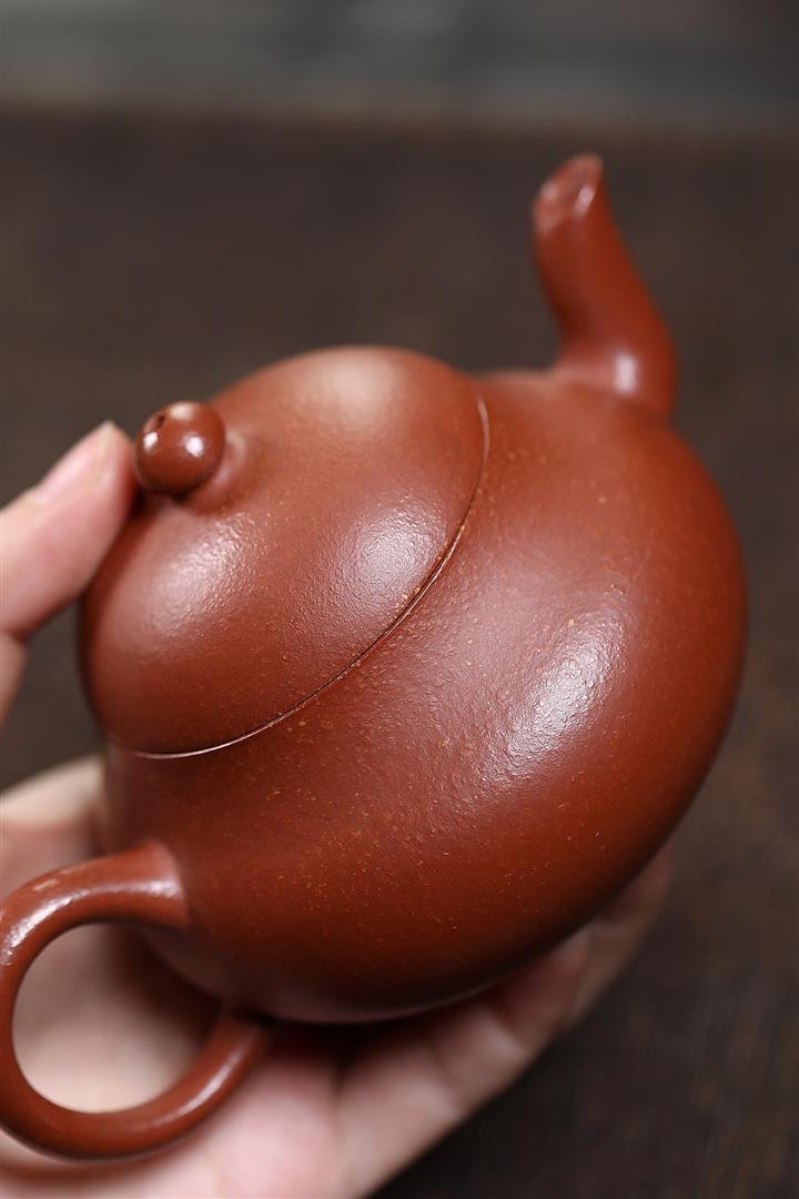 呈梨形式,線條上斂下鼓,飽滿圓潤,壺身線條柔順,過渡平滑,,壺蓋、壺身宛如壹個整體。把隨壺身走,嘴隨把尾出,壺把彎曲自然,線條優美,精巧雅致。