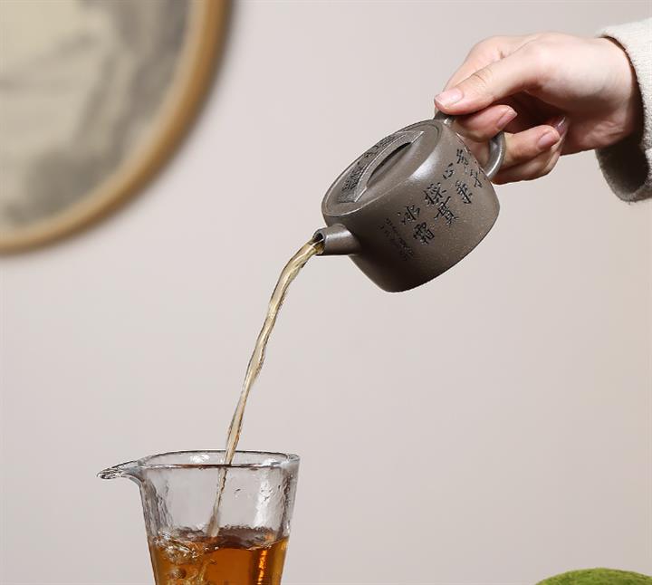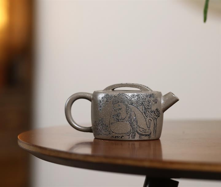 原礦墨綠泥手工滿刻觀山洋桶茶壺POT7107