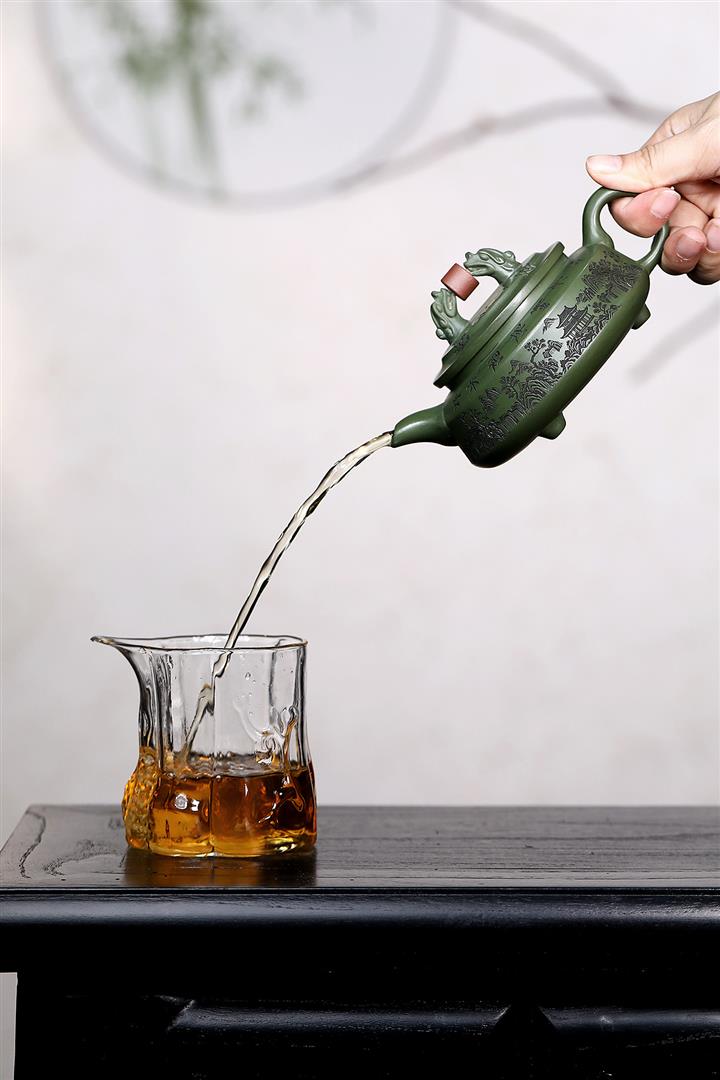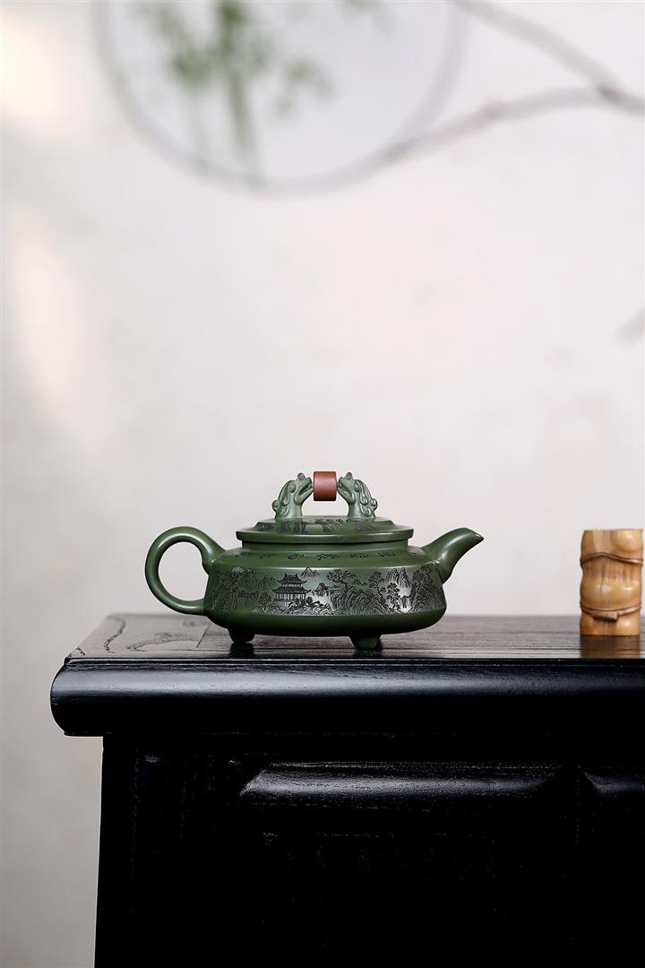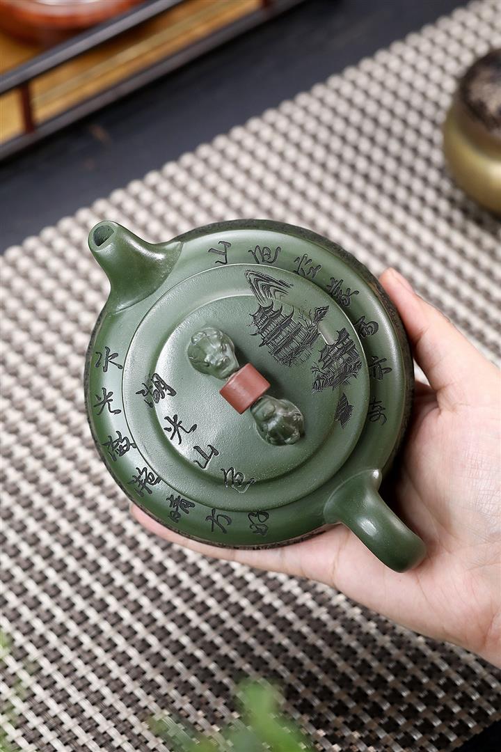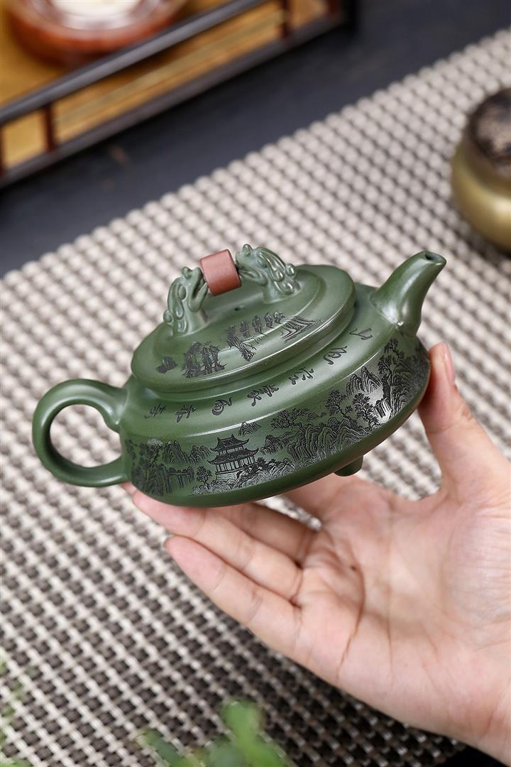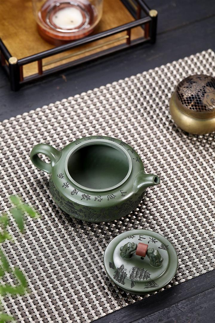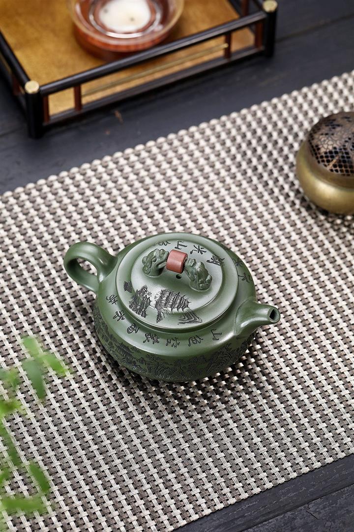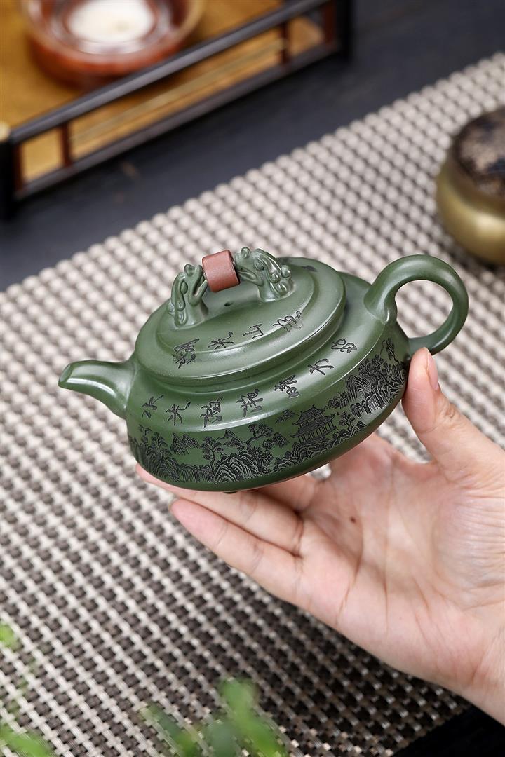 原礦綠泥手工刻繪時來運轉茶壺POT7096