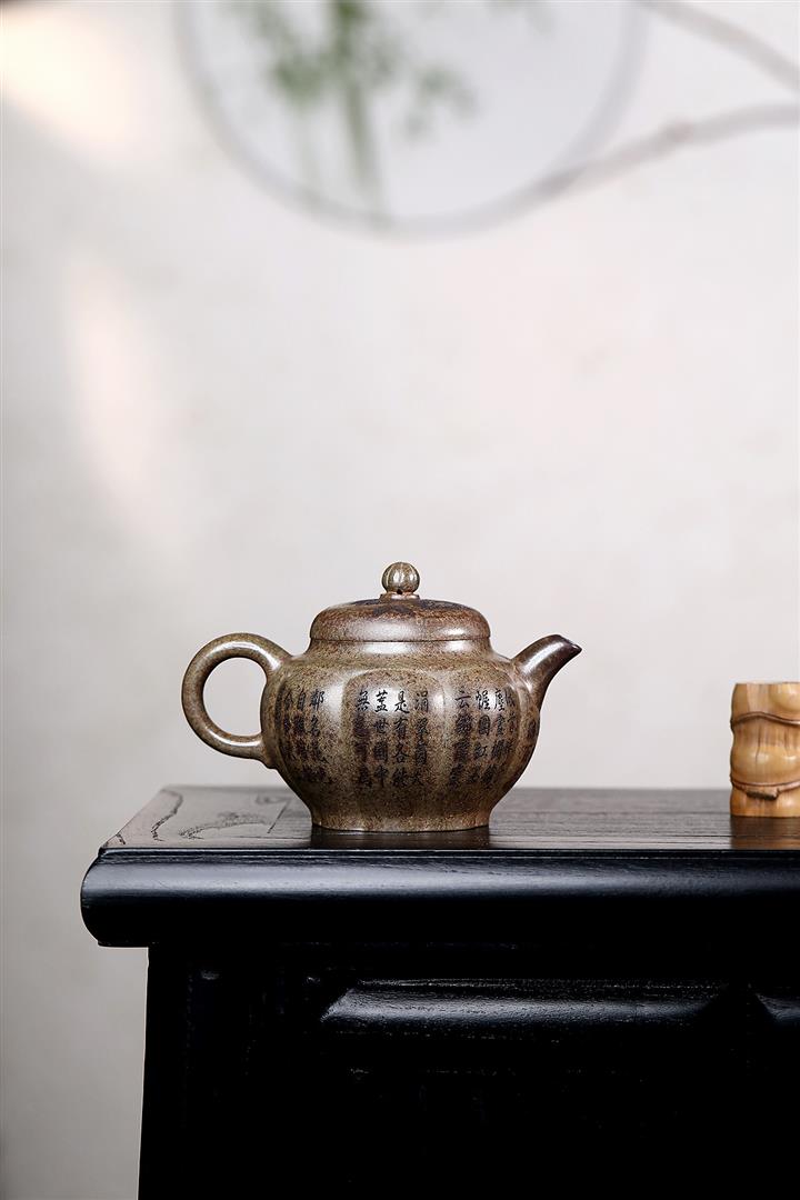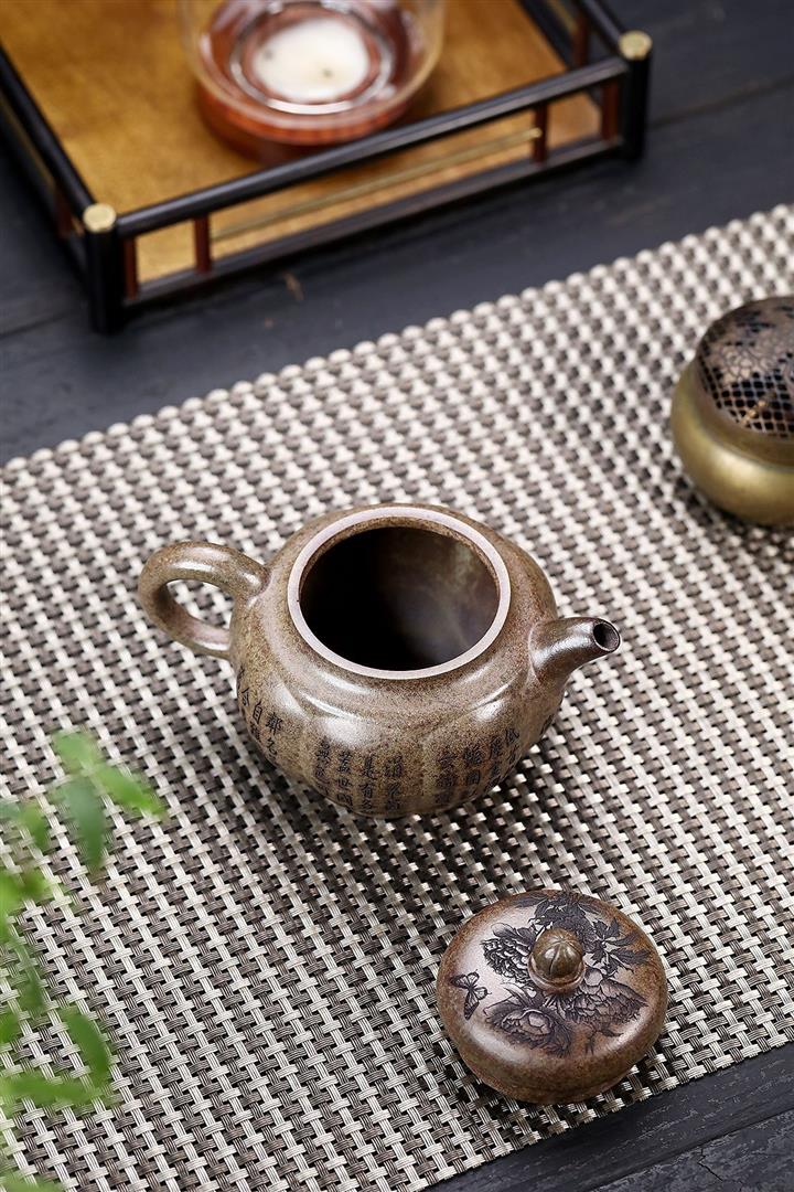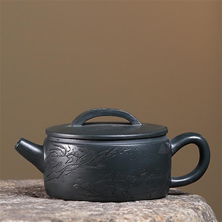 原礦墨綠泥手工滿刻觀山洋桶茶壺POT7107