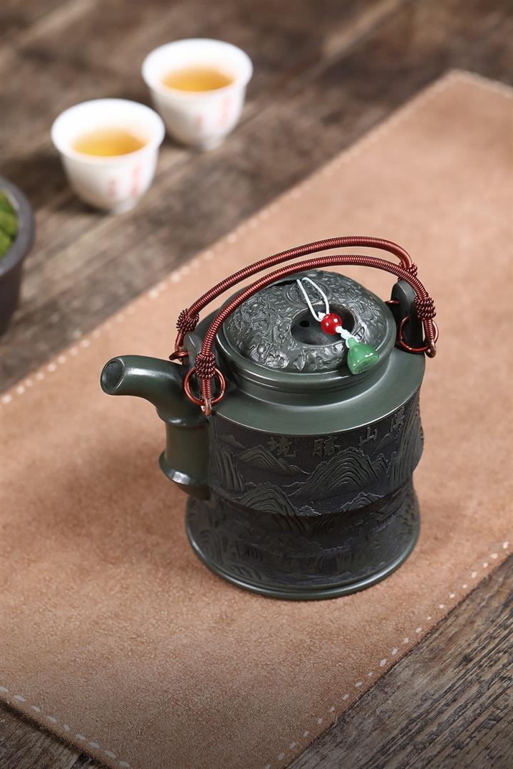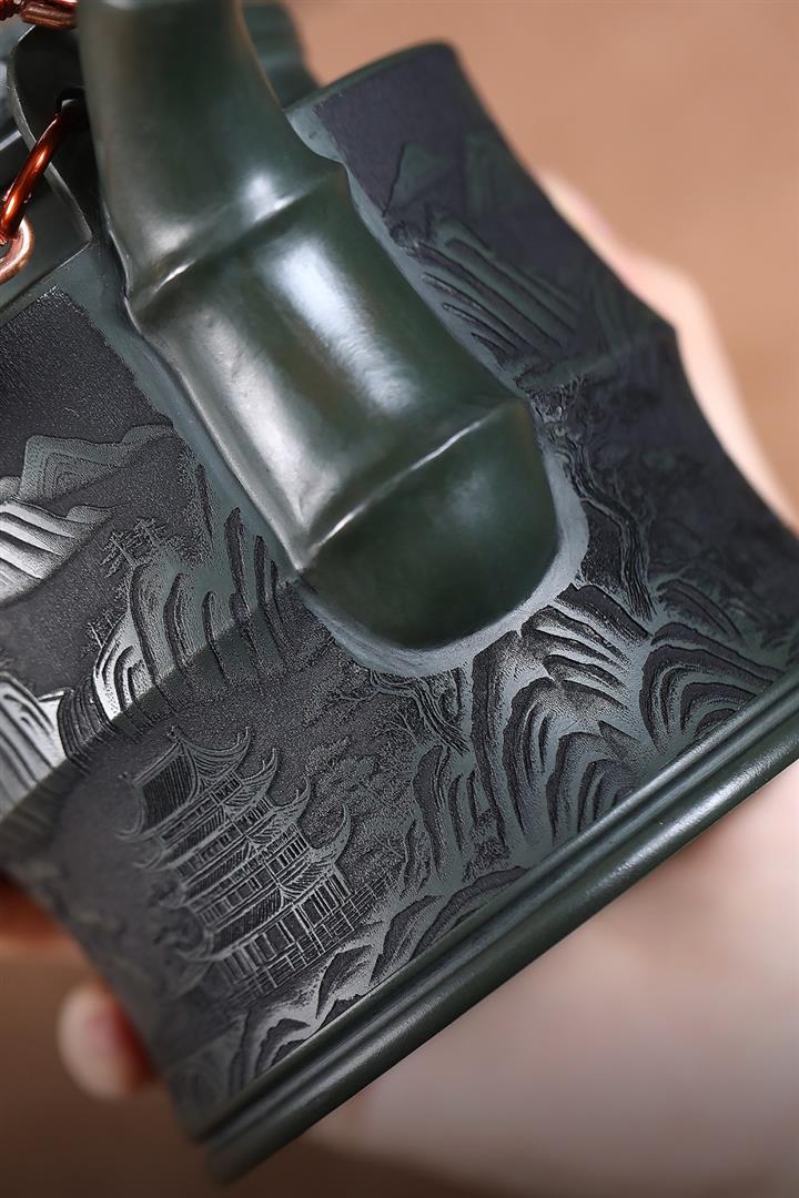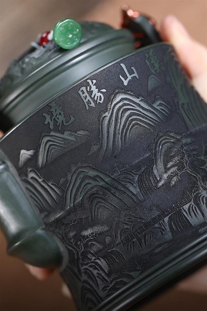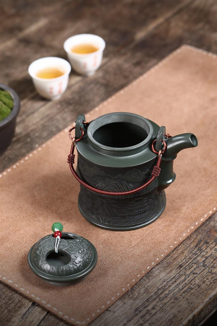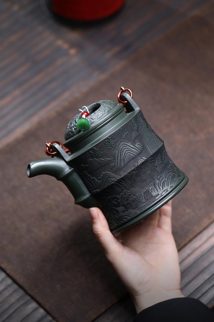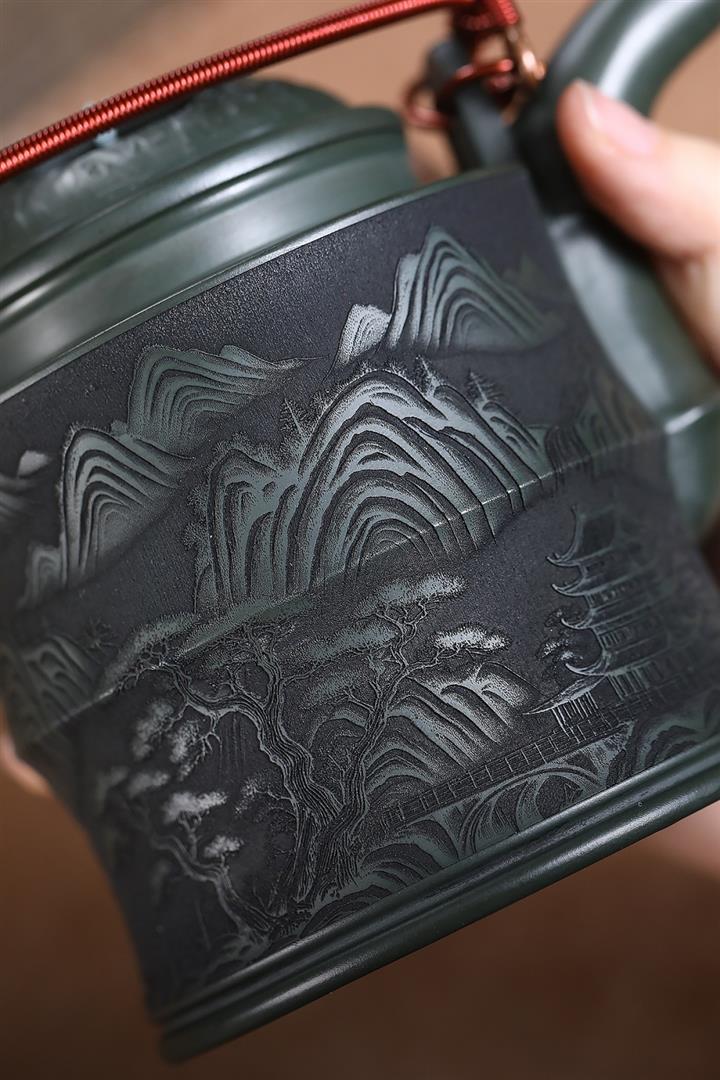 原礦墨綠泥手工滿刻觀山洋桶茶壺POT7107