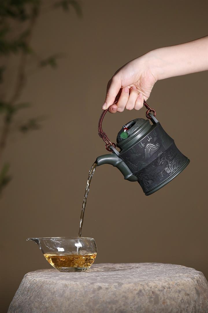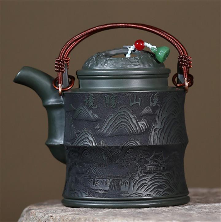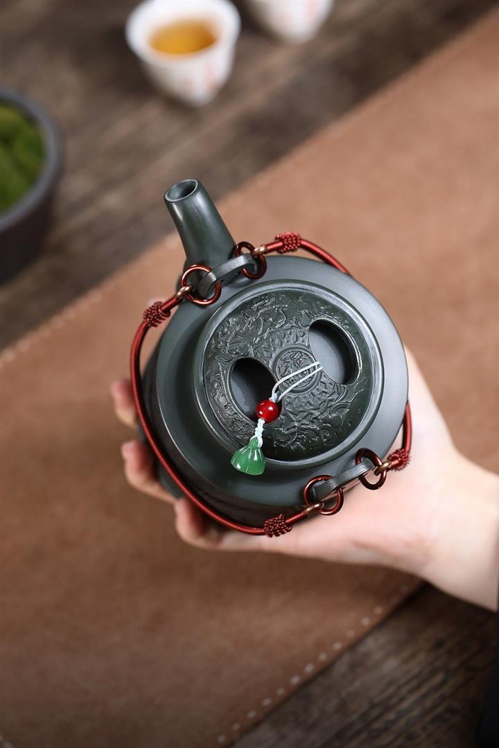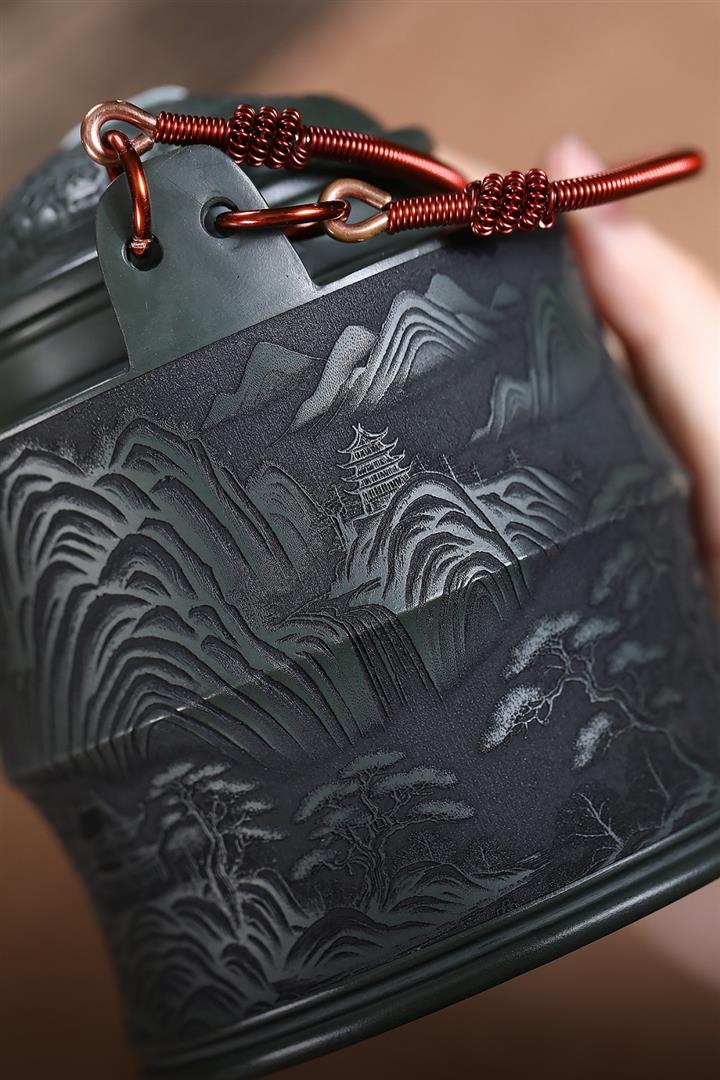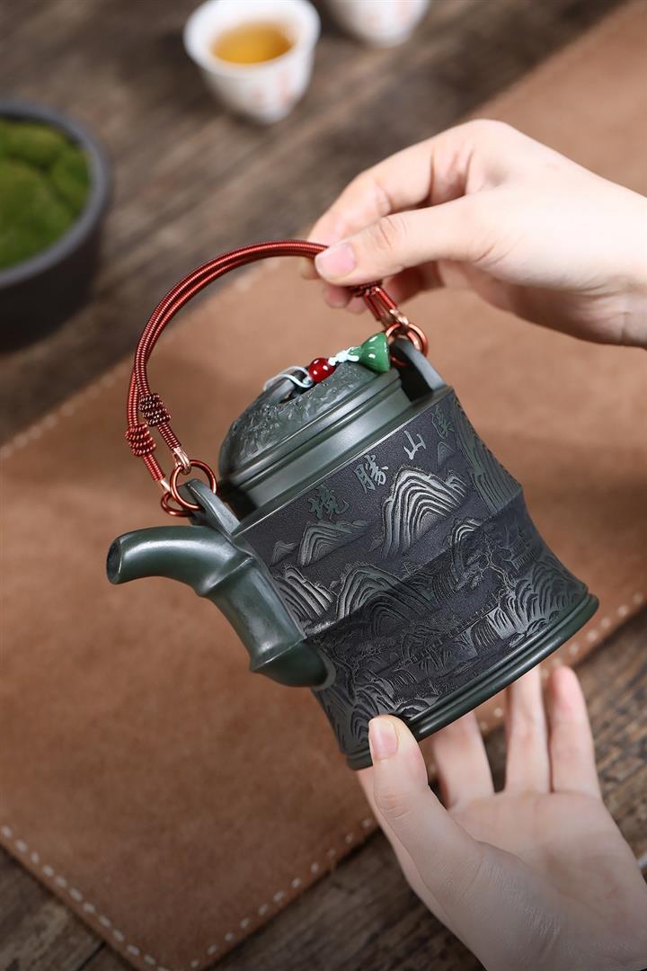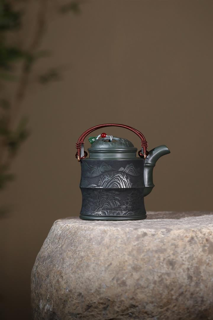 原礦墨綠泥手工滿刻觀山洋桶茶壺POT7107