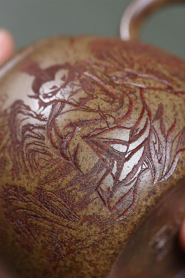 【泥料特點】砂土氣重,似淳實農民,日久使用,漸露鋒芒,養成變化甚大,溫潤莊重。線條優美自然,嘴把搭配協調,身桶配上細長的把搭配,更顯優生動……