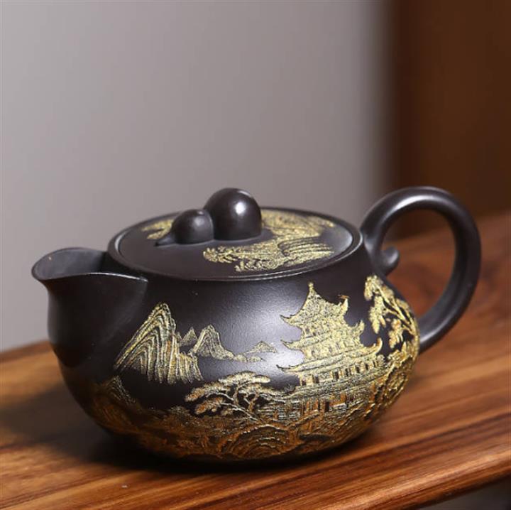 原礦石黃泥滿刻牛蓋茶壺POT7410