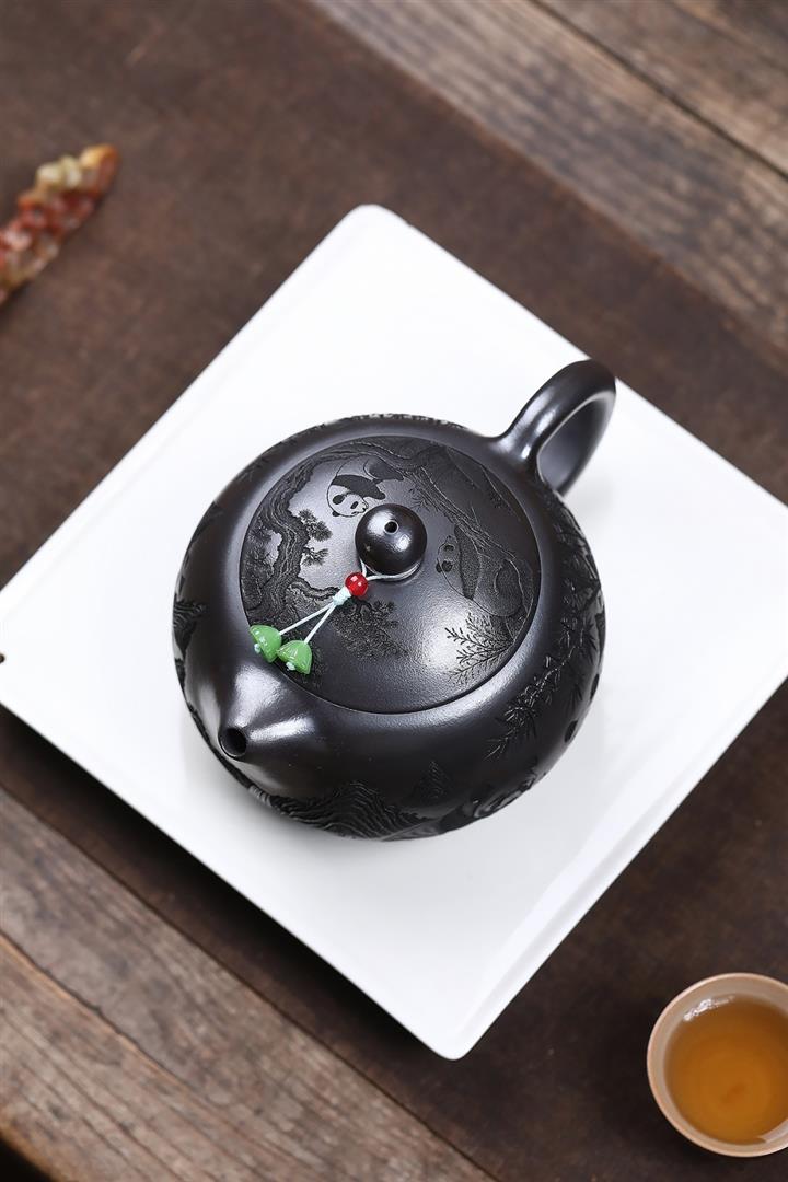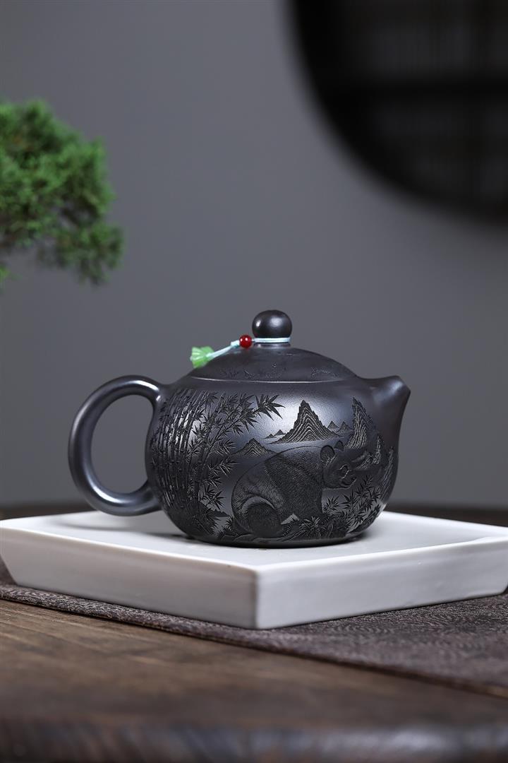 原礦石黃泥滿刻熊貓西施茶壺POT7412