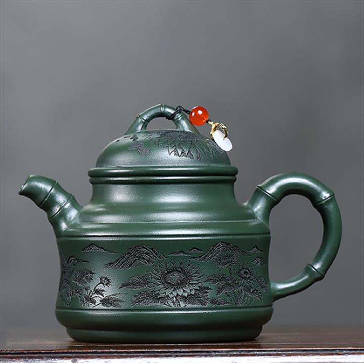 原礦綠泥刻繪花鳥竹鼎茶壺POT7569