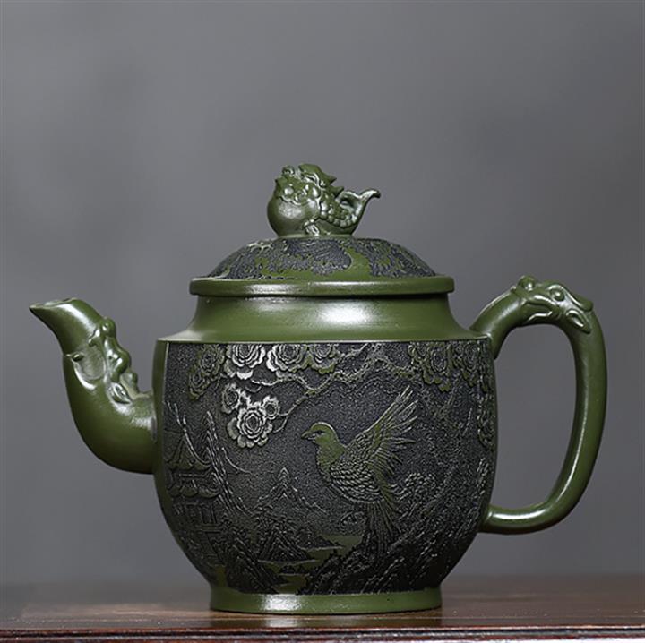 原礦綠泥刻繪花鳥宮燈茶壺POT7623
