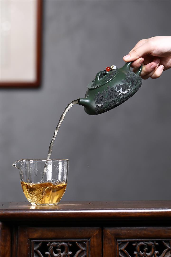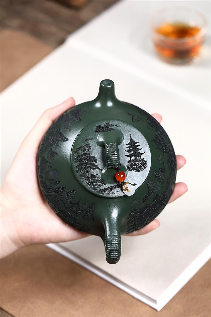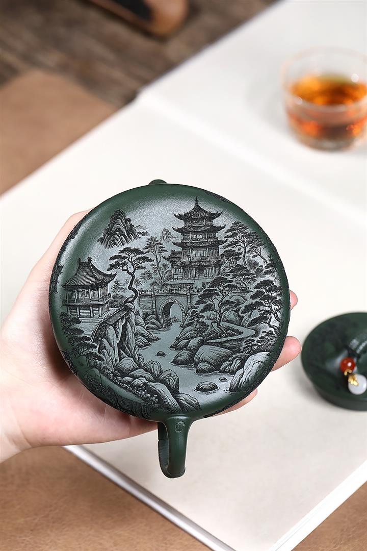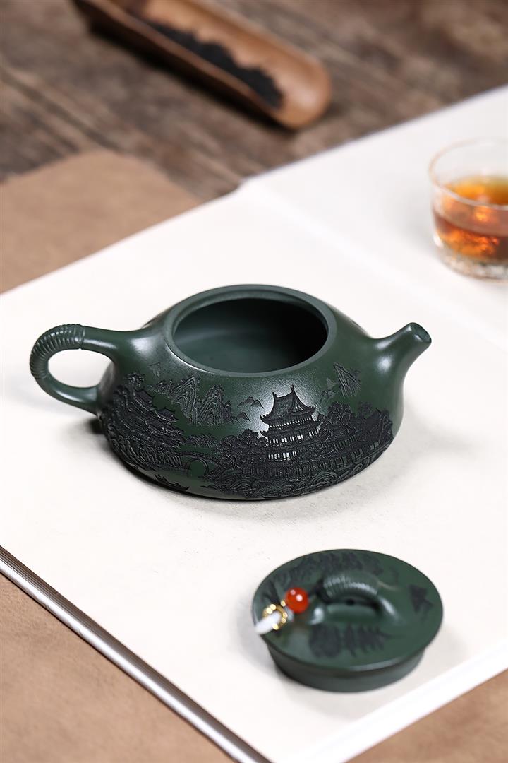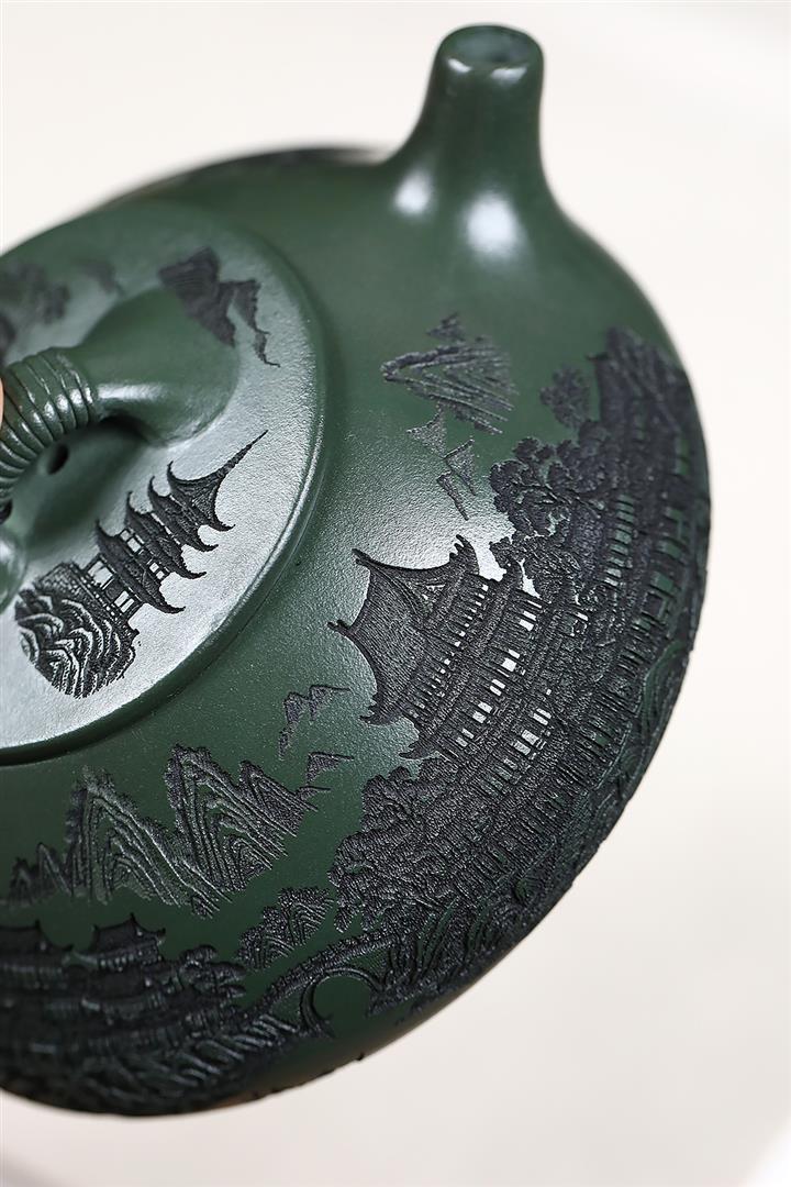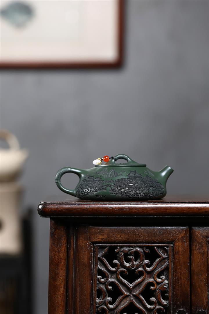 原礦綠泥刻繪山景線瓢茶壺POT7624