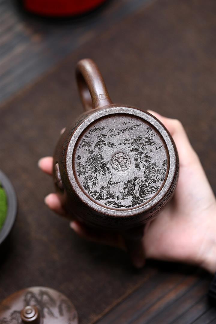 原礦石黃泥龍紋扁腹滿刻茶壺POT7723