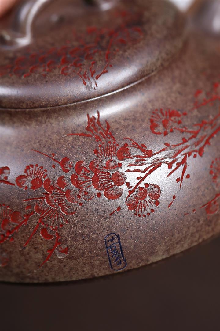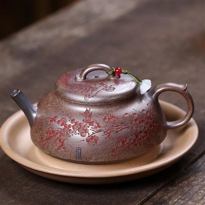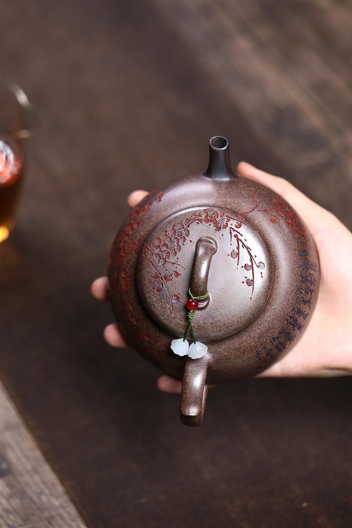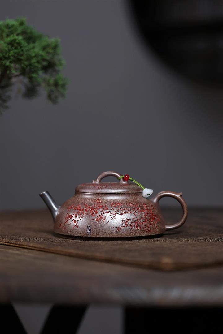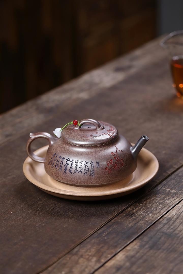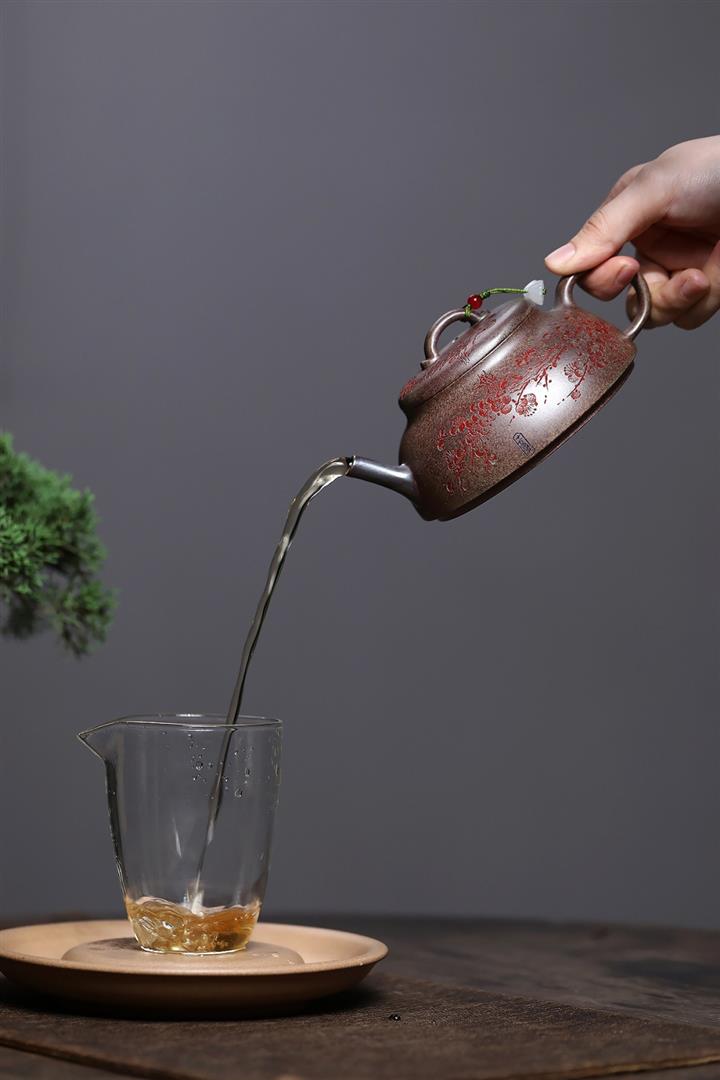 【泥料特點】砂土氣重,似淳實農民,日久使用,漸露鋒芒,養成變化,溫潤莊重。紫砂是壹種雙重氣孔結構的多孔性材質,氣孔微細,密度高。用紫砂壺沏茶,不失原味,且香不渙散,得茶之真香真味。紫砂使用越久,壺身色澤越發光亮照人,氣韻溫雅。紫砂壺長久使用器身會因撫摸擦拭,變得越發溫潤光澤。