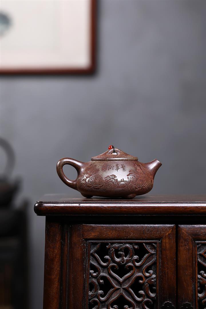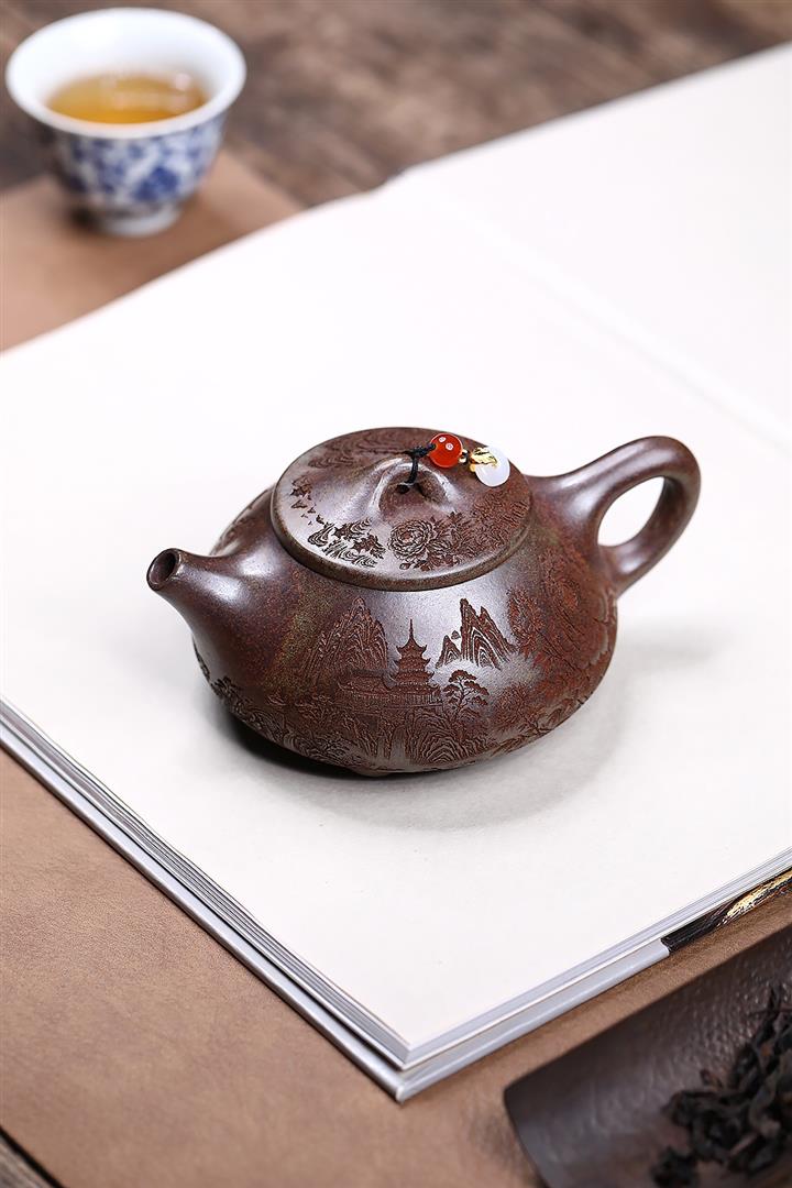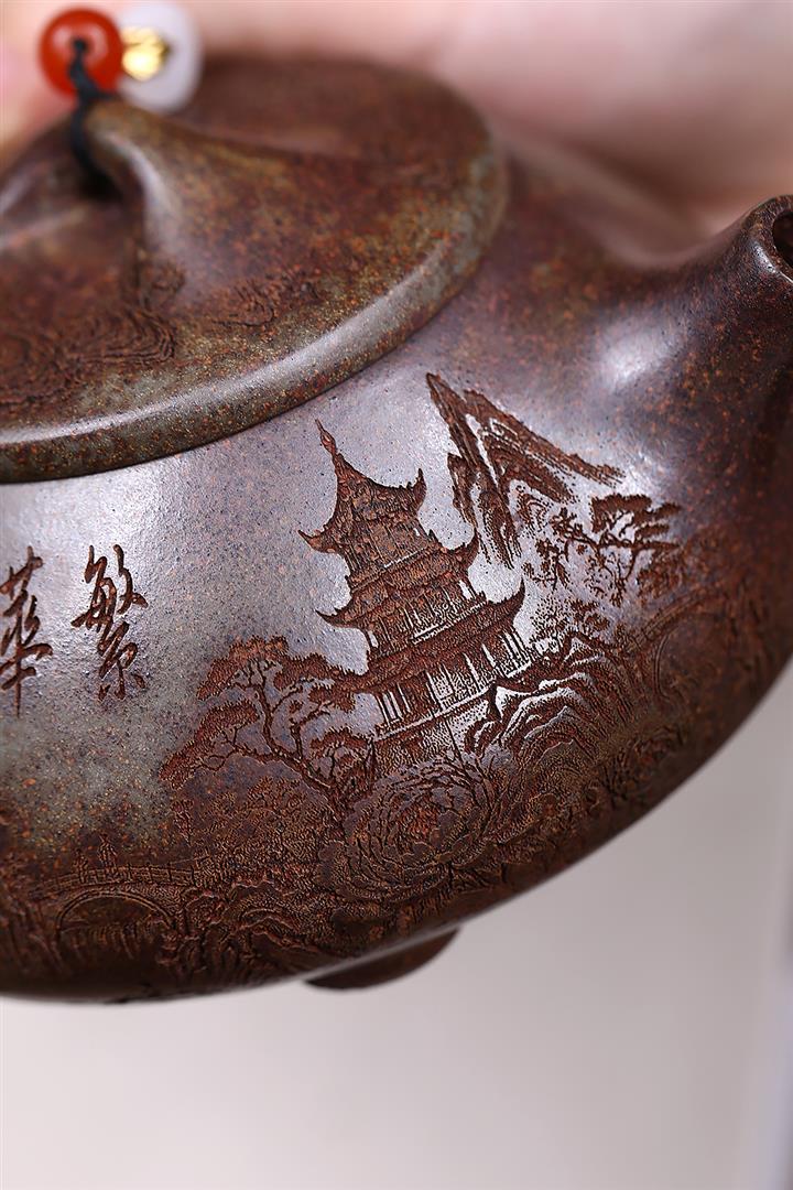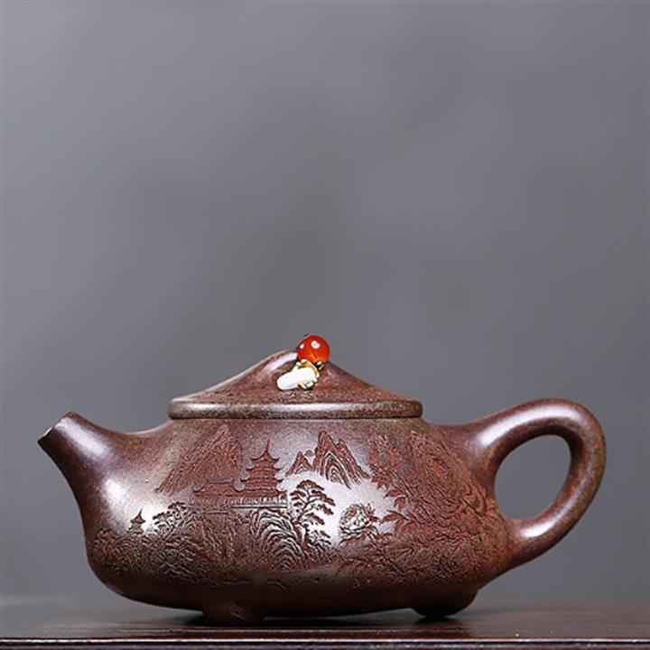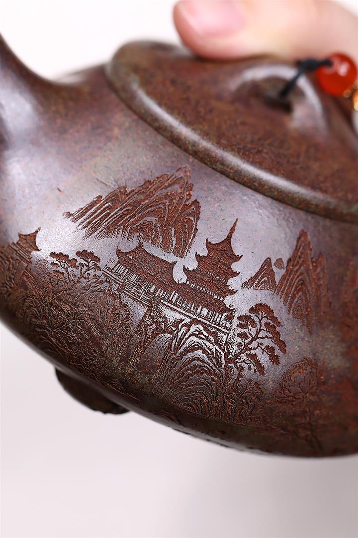 原礦紫泥刻繪山水德鐘茶壺POT7787