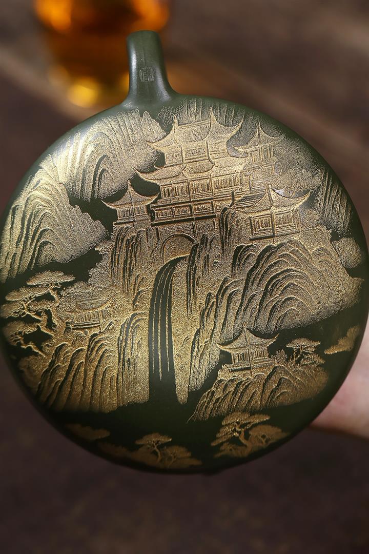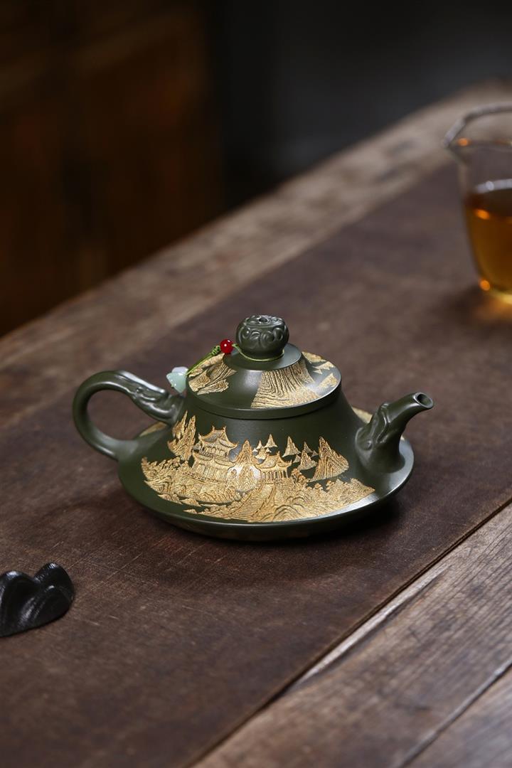 原礦綠泥滿刻三羊開胎茶壺POT7846