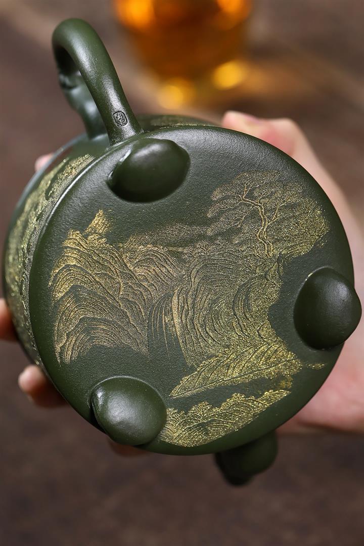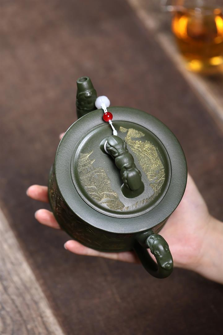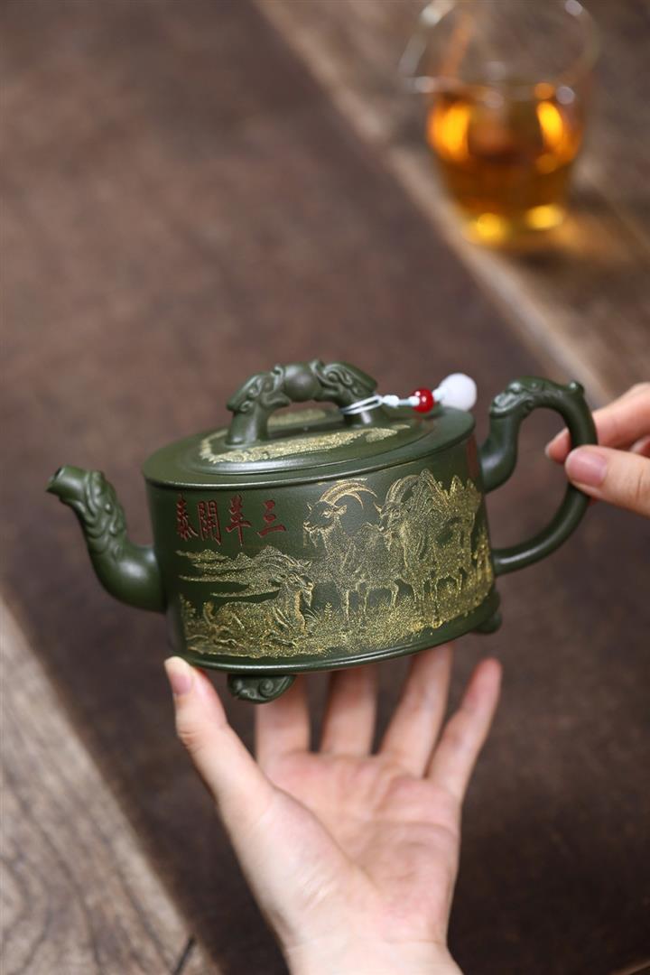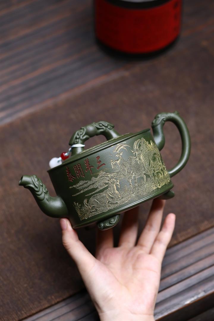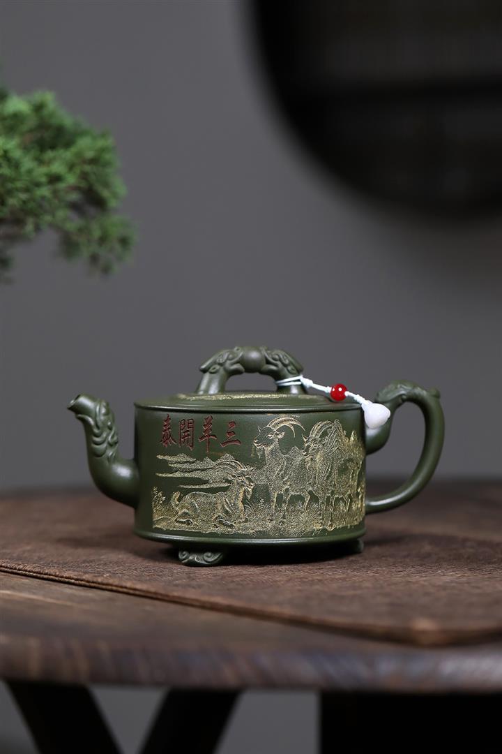 原礦綠泥滿刻三羊開胎茶壺POT7846