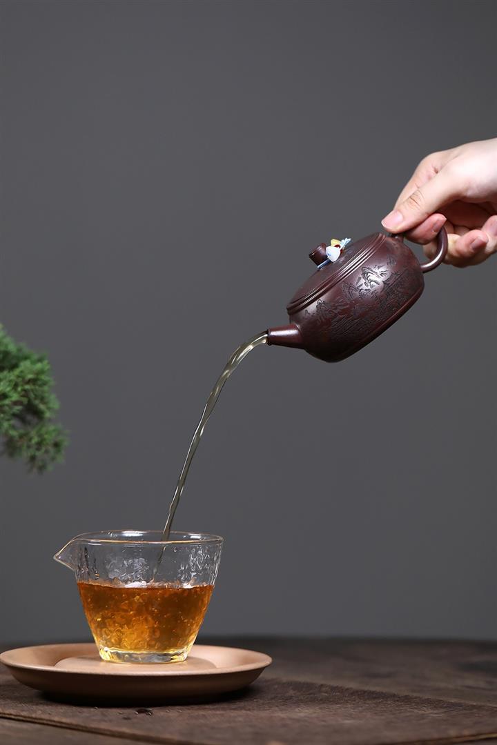 【泥料特點】砂土氣重,似淳實農民,日久使用,漸露鋒芒,養成變化,溫潤莊重。紫砂是壹種雙重氣孔結構的多孔性材質,氣孔微細,密度高。用紫砂壺沏茶,不失原味,且香不渙散,得茶之真香真味。紫砂使用越久,壺身色澤越發光亮照人,氣韻溫雅。紫砂壺長久使用器身會因撫摸擦拭,變得越發溫潤光澤。
