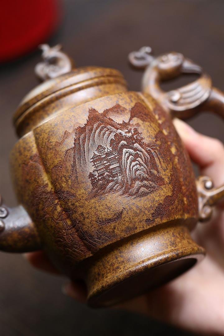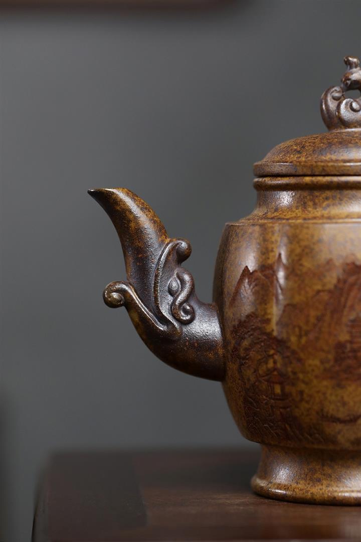 原礦紫泥刻繪山水德鐘茶壺POT7787