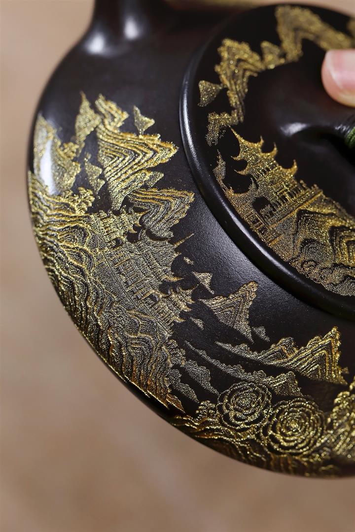 210cc原礦石黃泥滿刻山水線瓢茶壺POT7920