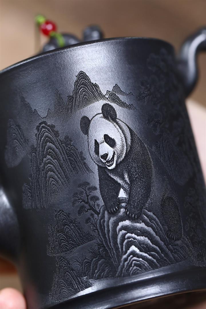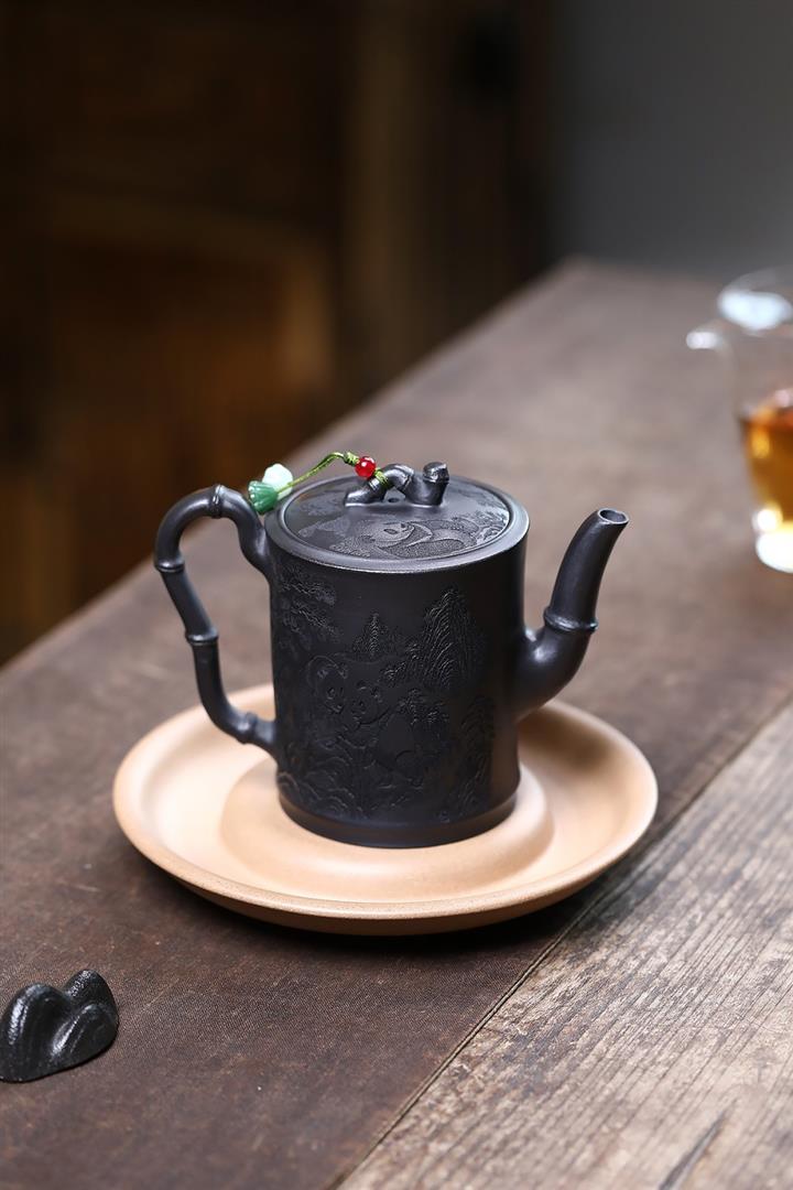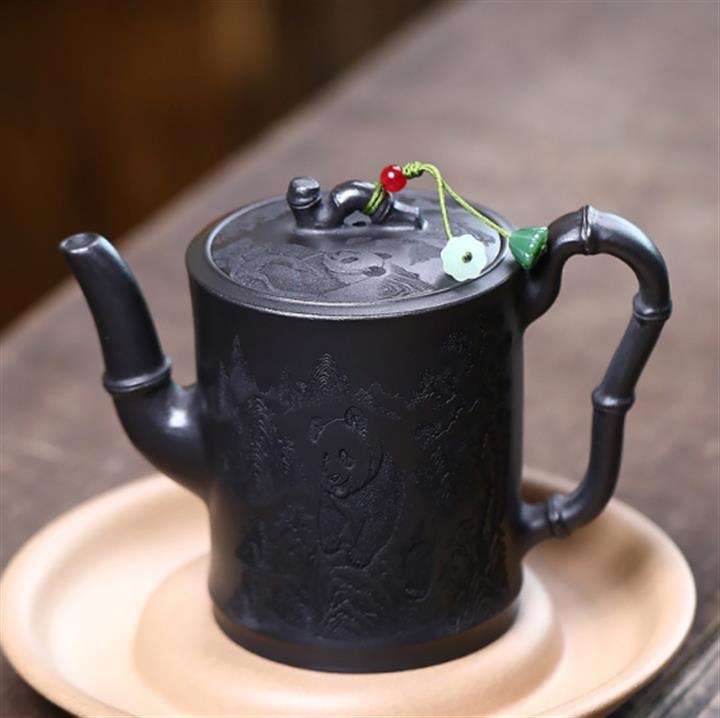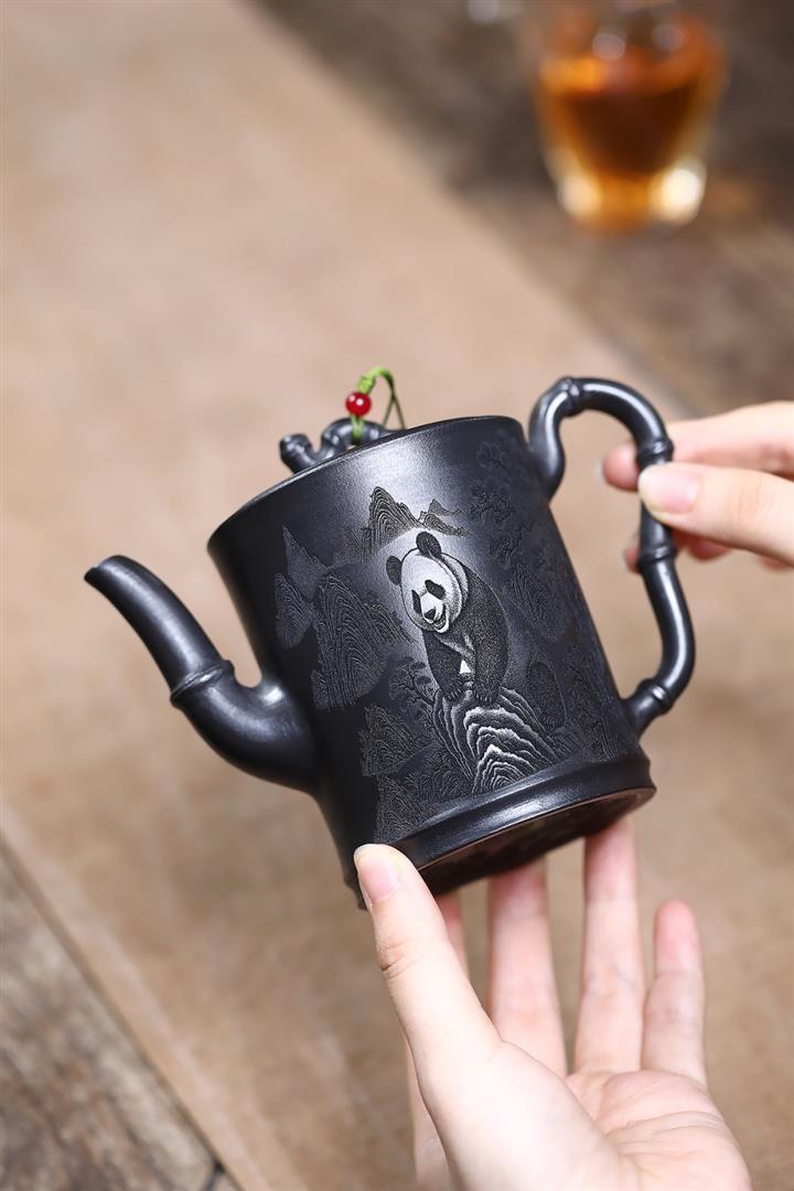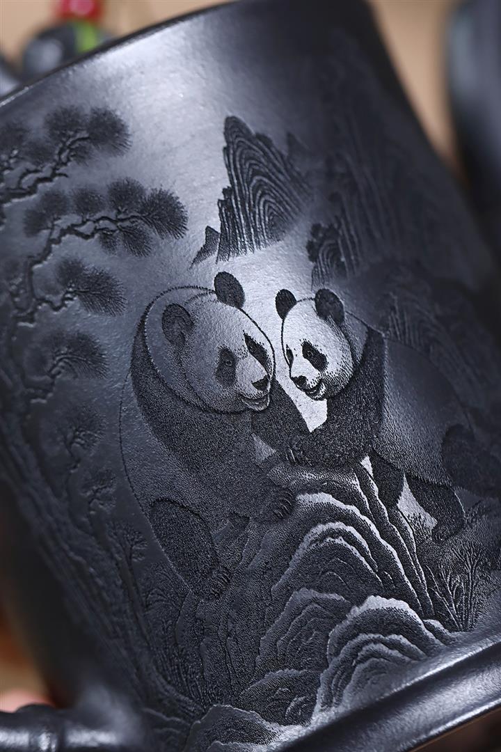 320cc原礦石黃泥滿刻熊貓茶壺POT7934