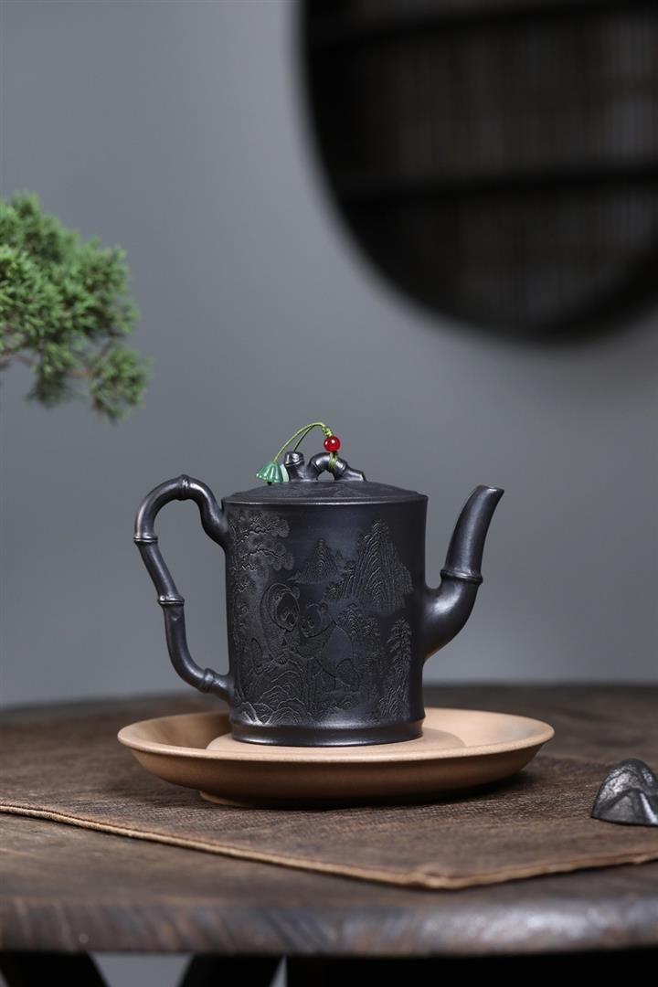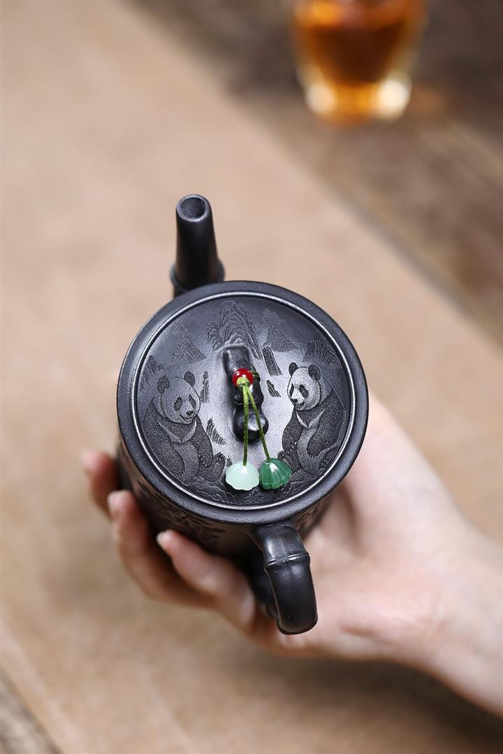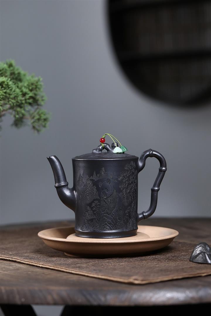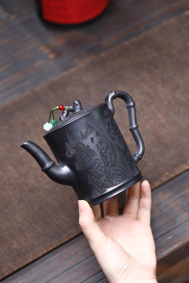 320cc原礦石黃泥滿刻熊貓茶壺POT7934