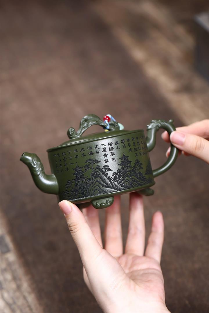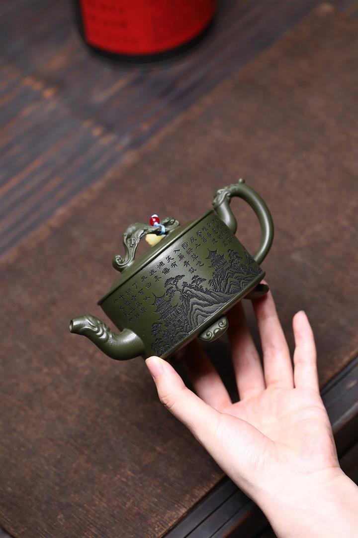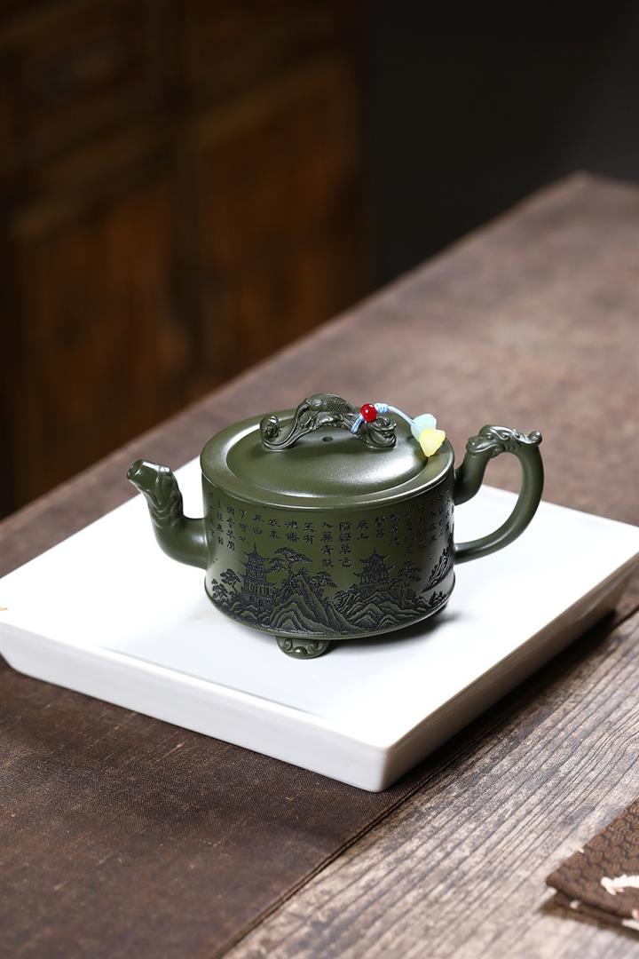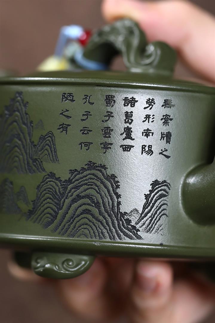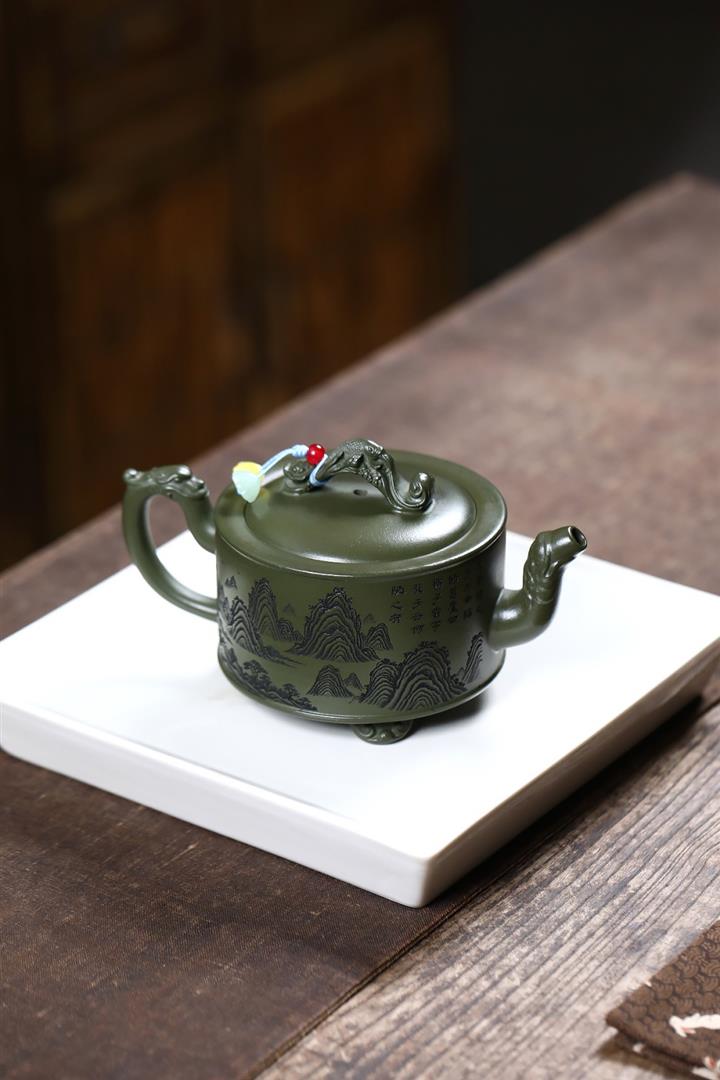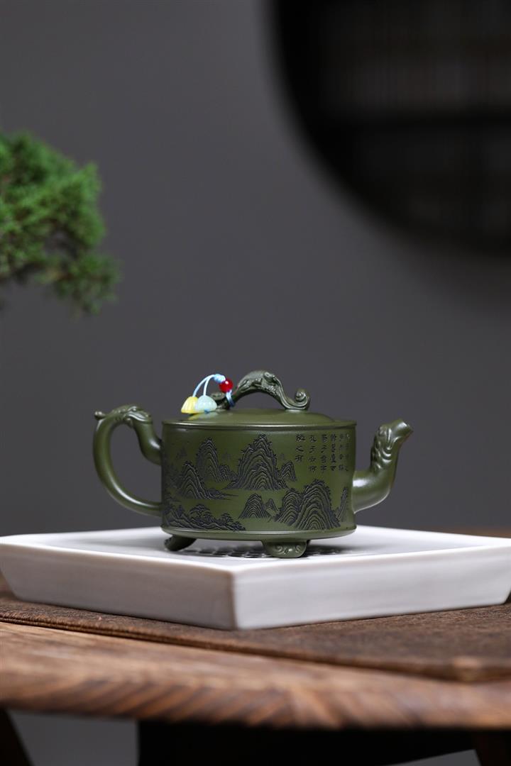 250cc原礦綠泥樂山樂水三足茶壺POT7984