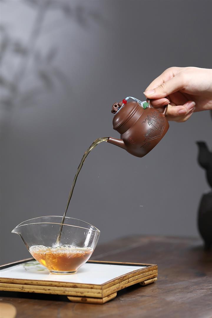 【泥料特點】砂土氣重,似淳實農民,日久使用,漸露鋒芒,養成變化,溫潤莊重。紫砂是壹種雙重氣孔結構的多孔性材質,氣孔微細,密度高。用紫砂壺沏茶,不失原味,且香不渙散,得茶之真香真味。紫砂使用越久,壺身色澤越發光亮照人,氣韻溫雅。紫砂壺長久使用器身會因撫摸擦拭,變得越發溫潤光澤。