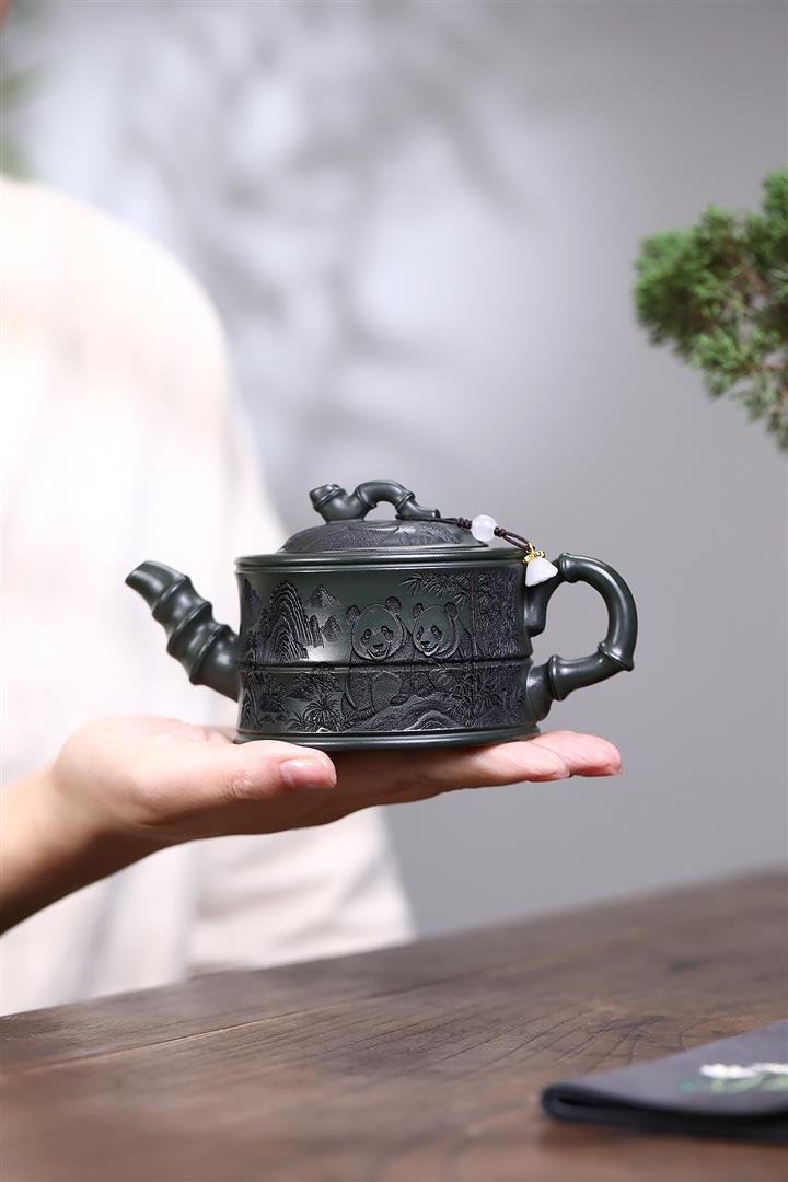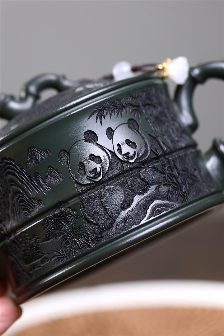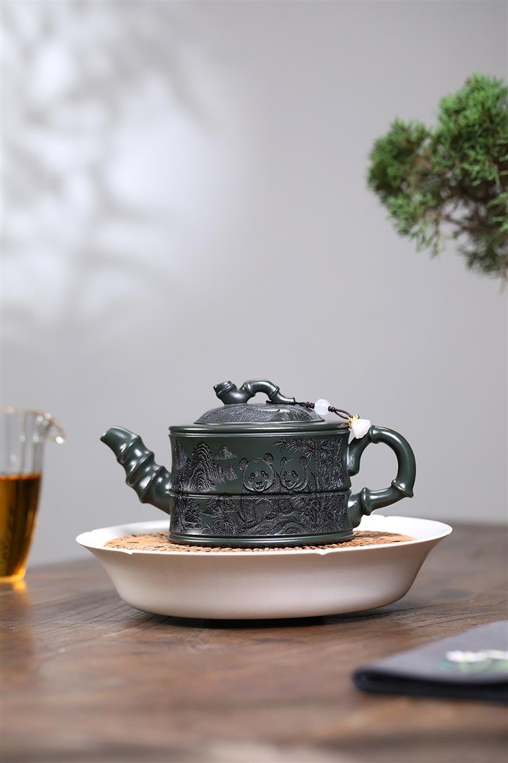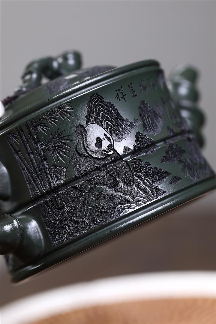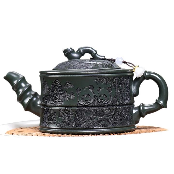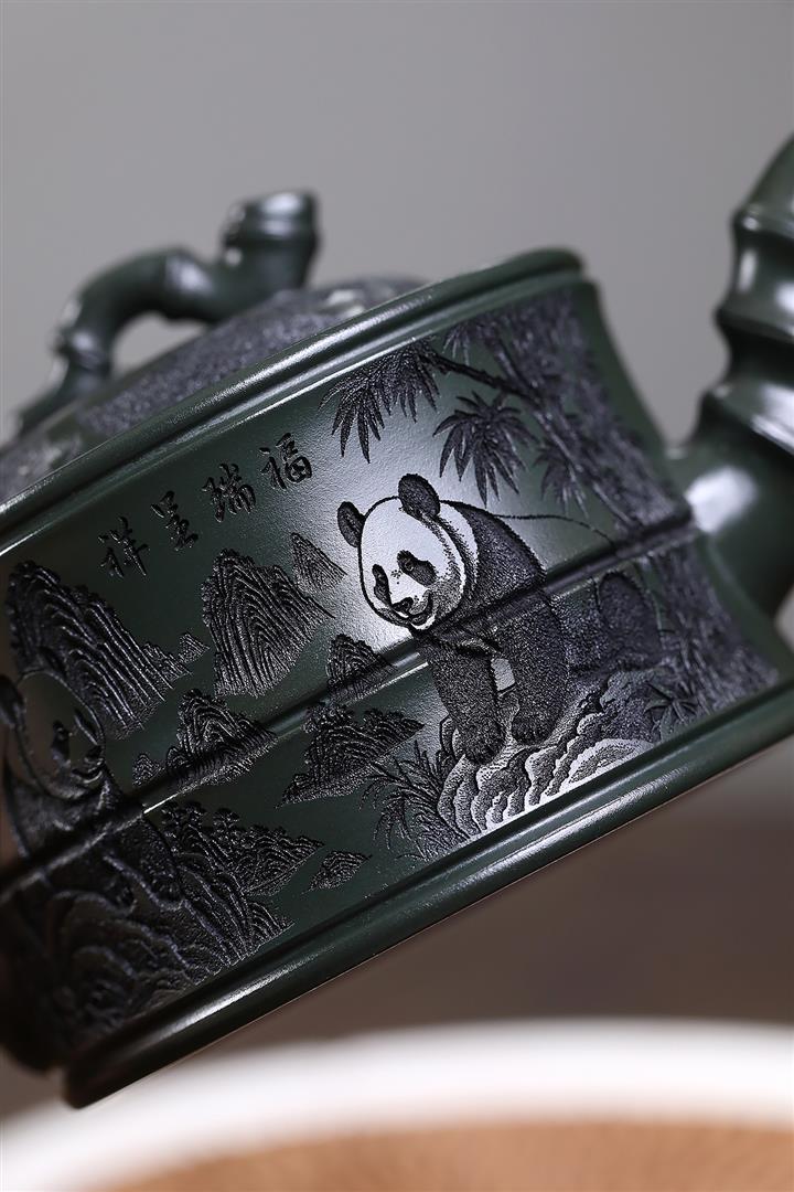 260cc原礦綠泥滿刻熊貓竹段茶壺POT8073