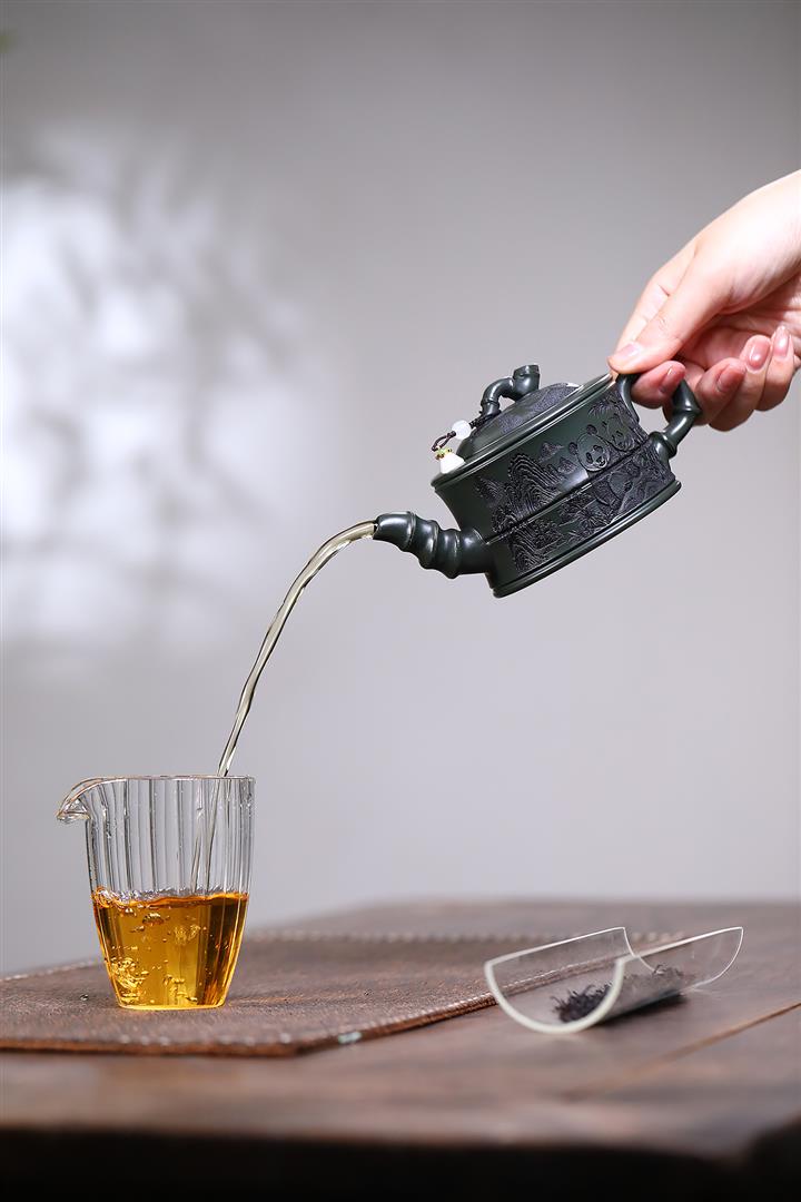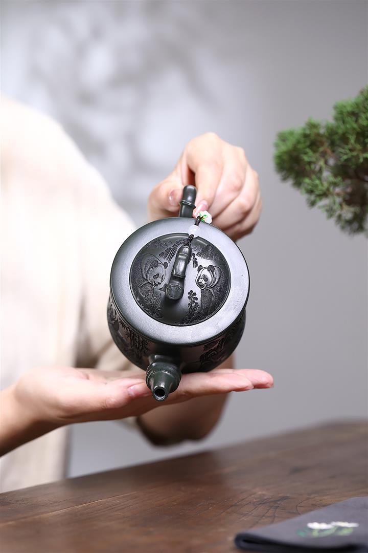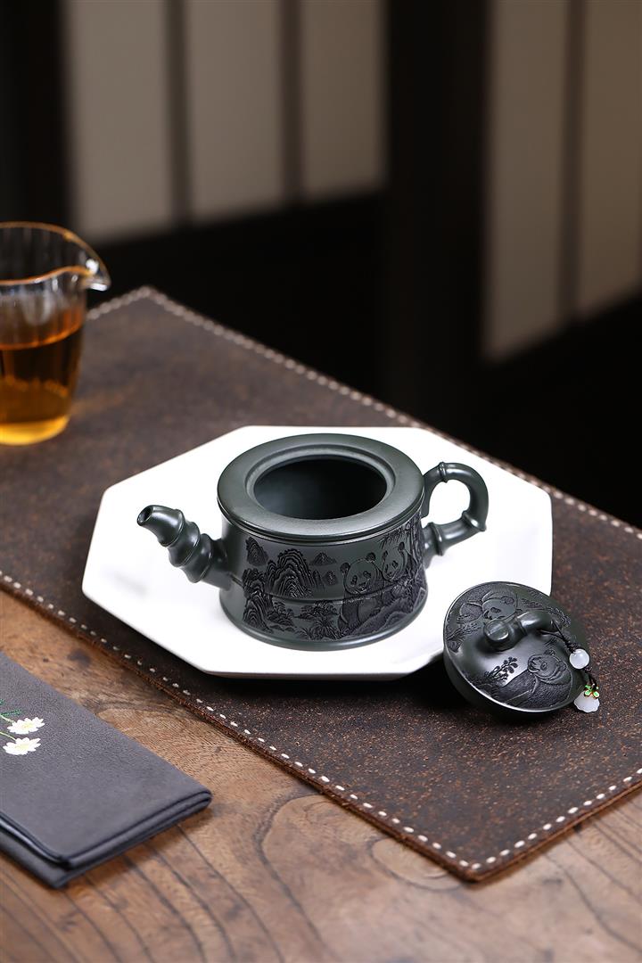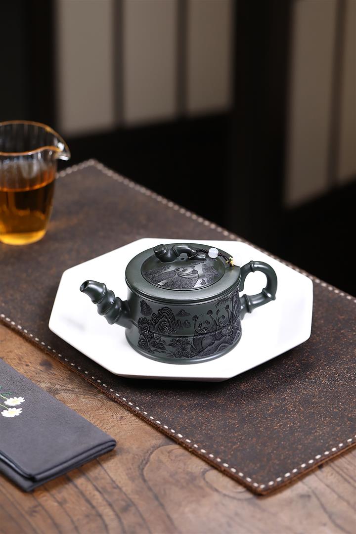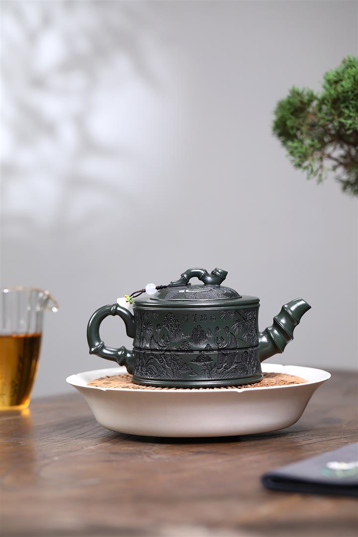 260cc原礦綠泥滿刻熊貓竹段茶壺POT8073