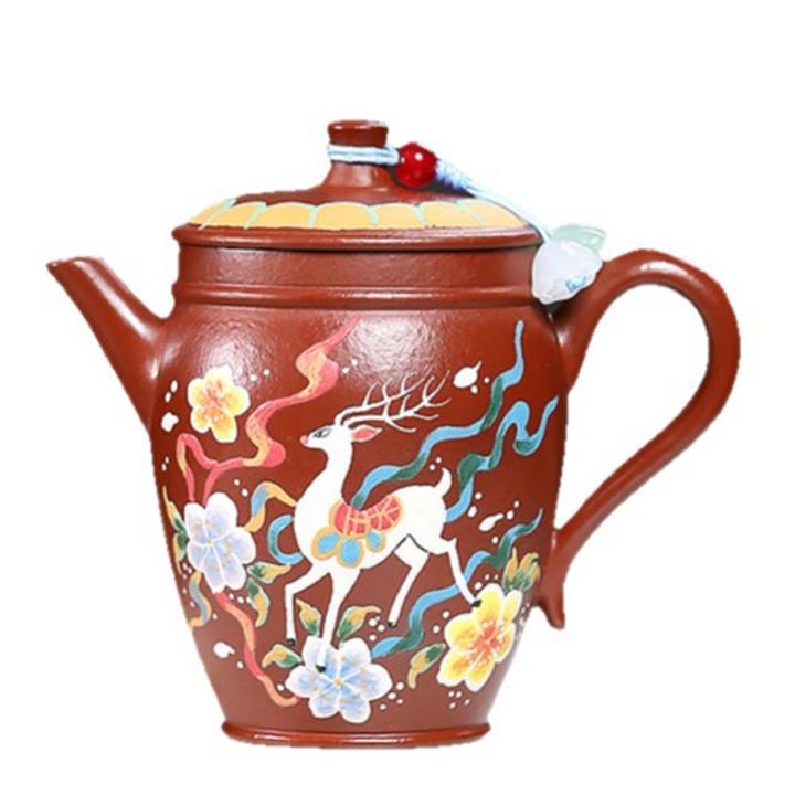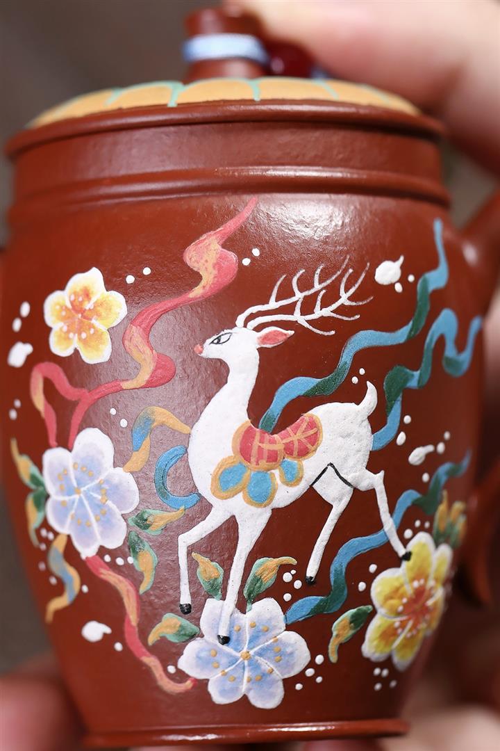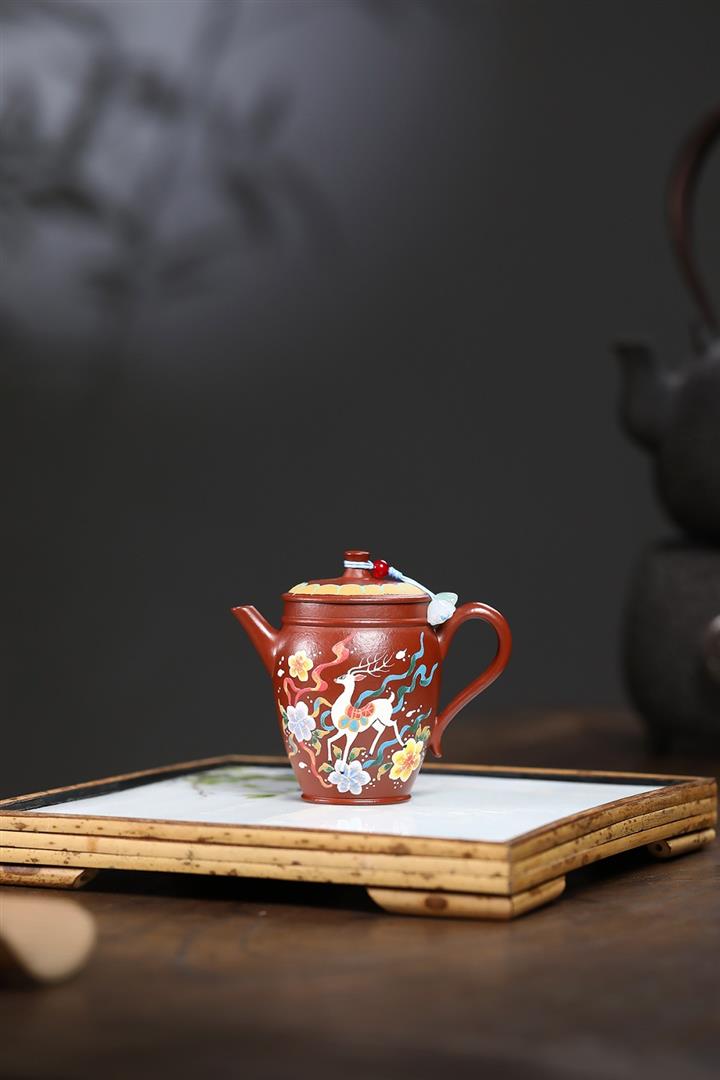 110cc原礦粗砂朱泥泥繪神鹿竹筒茶壺POT8086