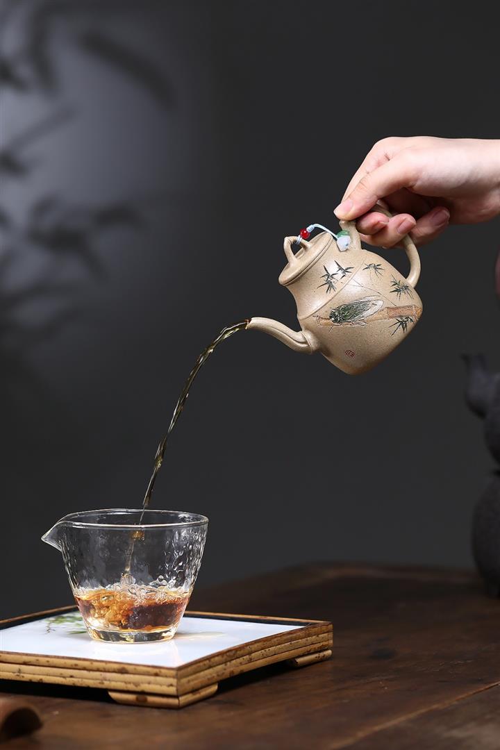 【泥料特點】砂土氣重,似淳實農民,日久使用,漸露鋒芒,養成變化,溫潤莊重。紫砂是壹種雙重氣孔結構的多孔性材質,氣孔微細,密度高。用紫砂壺沏茶,不失原味,且香不渙散,得茶之真香真味。紫砂使用越久,壺身色澤越發光亮照人,氣韻溫雅。紫砂壺長久使用器身會因撫摸擦拭,變得越發溫潤光澤。