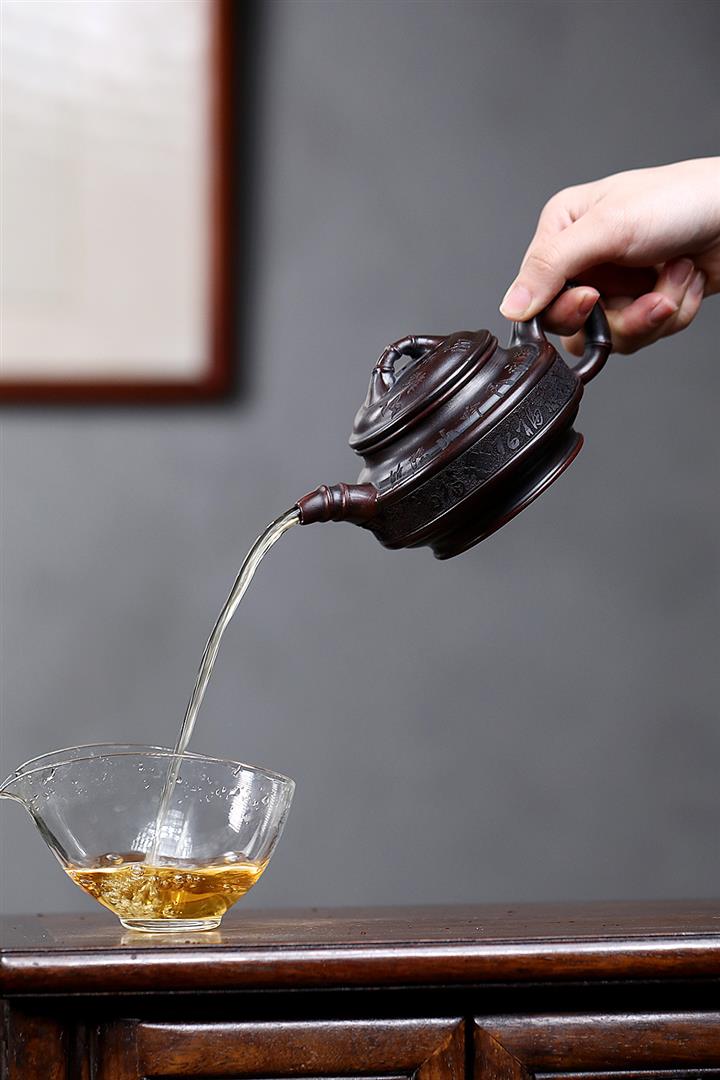 【泥料特點】砂土氣重,似淳實農民,日久使用,漸露鋒芒,養成變化,溫潤莊重。紫砂是壹種雙重氣孔結構的多孔性材質,氣孔微細,密度高。用紫砂壺沏茶,不失原味,且香不渙散,得茶之真香真味。紫砂使用越久,壺身色澤越發光亮照人,氣韻溫雅。紫砂壺長久使用器身會因撫摸擦拭,變得越發溫潤光澤。