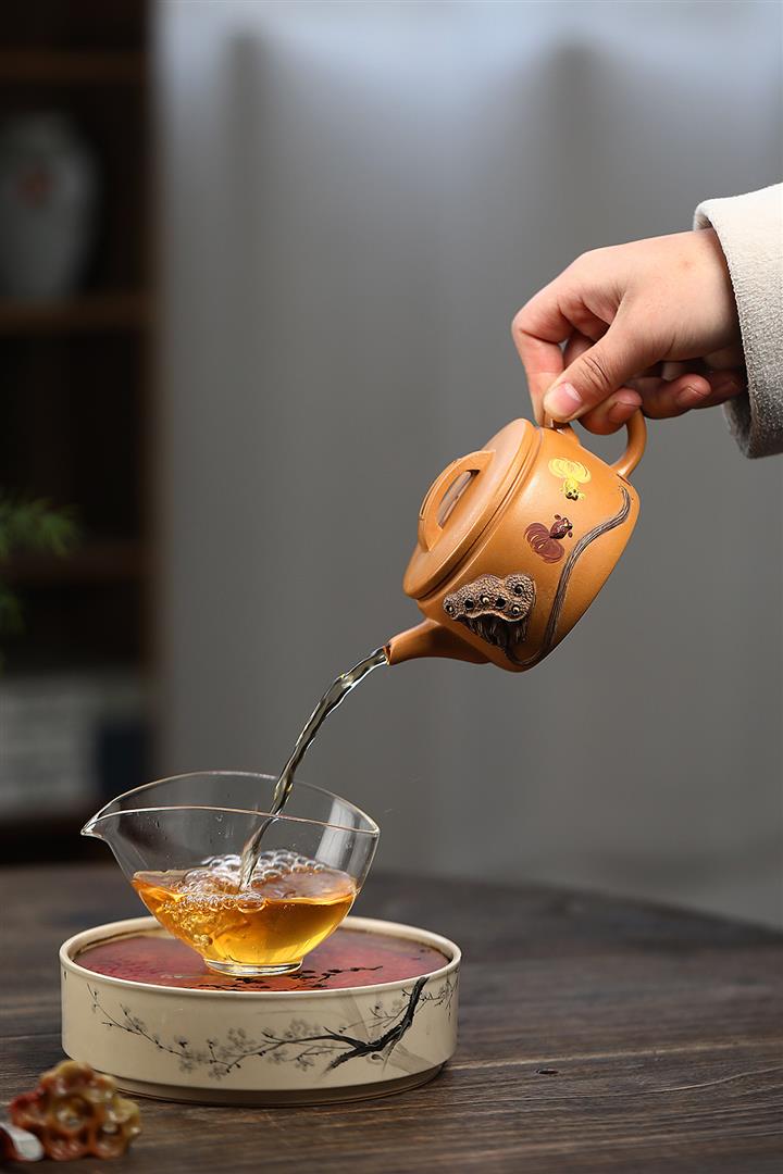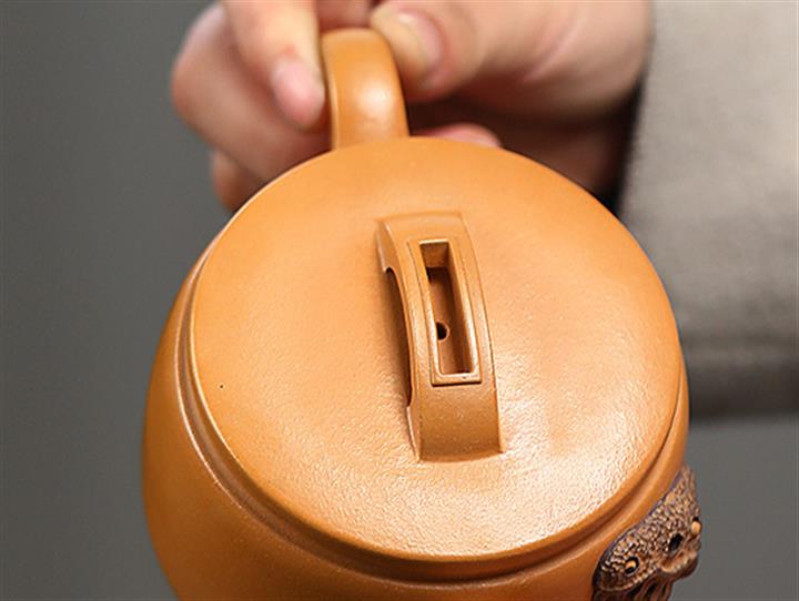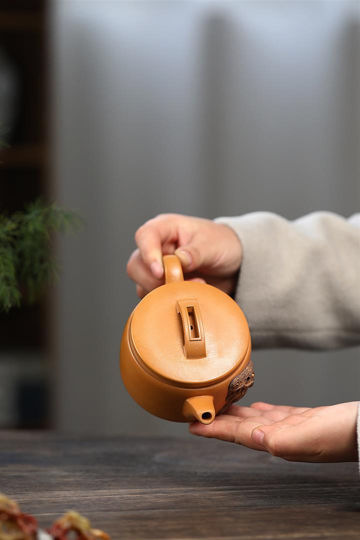 【泥料特點】砂土氣重,似淳實農民,日久使用,漸露鋒芒,養成變化,溫潤莊重。紫砂是壹種雙重氣孔結構的多孔性材質,氣孔微細,密度高。用紫砂壺沏茶,不失原味,且香不渙散,得茶之真香真味。紫砂使用越久,壺身色澤越發光亮照人,氣韻溫雅。紫砂壺長久使用器身會因撫摸擦拭,變得越發溫潤光澤。