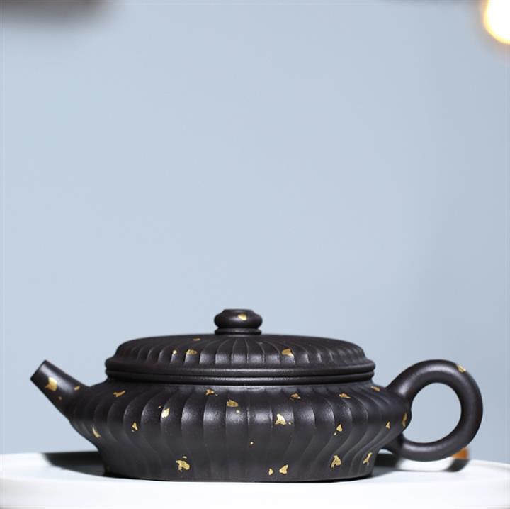 280cc原礦黑料描撒灑金筋紋虛扁茶壺POT8153