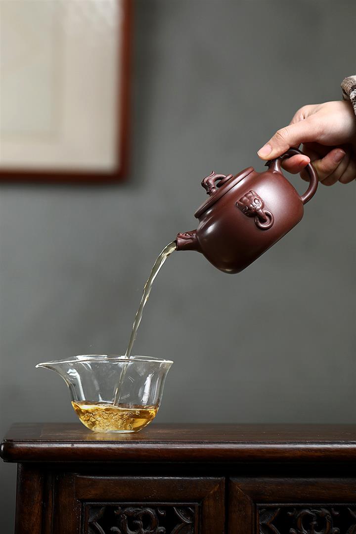【泥料特點】砂土氣重,似淳實農民,日久使用,漸露鋒芒,養成變化,溫潤莊重。紫砂是壹種雙重氣孔結構的多孔性材質,氣孔微細,密度高。用紫砂壺沏茶,不失原味,且香不渙散,得茶之真香真味。紫砂使用越久,壺身色澤越發光亮照人,氣韻溫雅。紫砂壺長久使用器身會因撫摸擦拭,變得越發溫潤光澤。