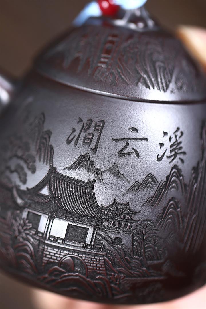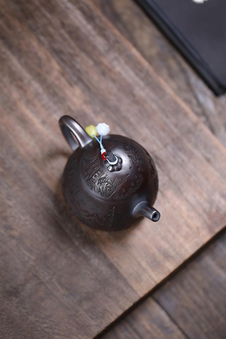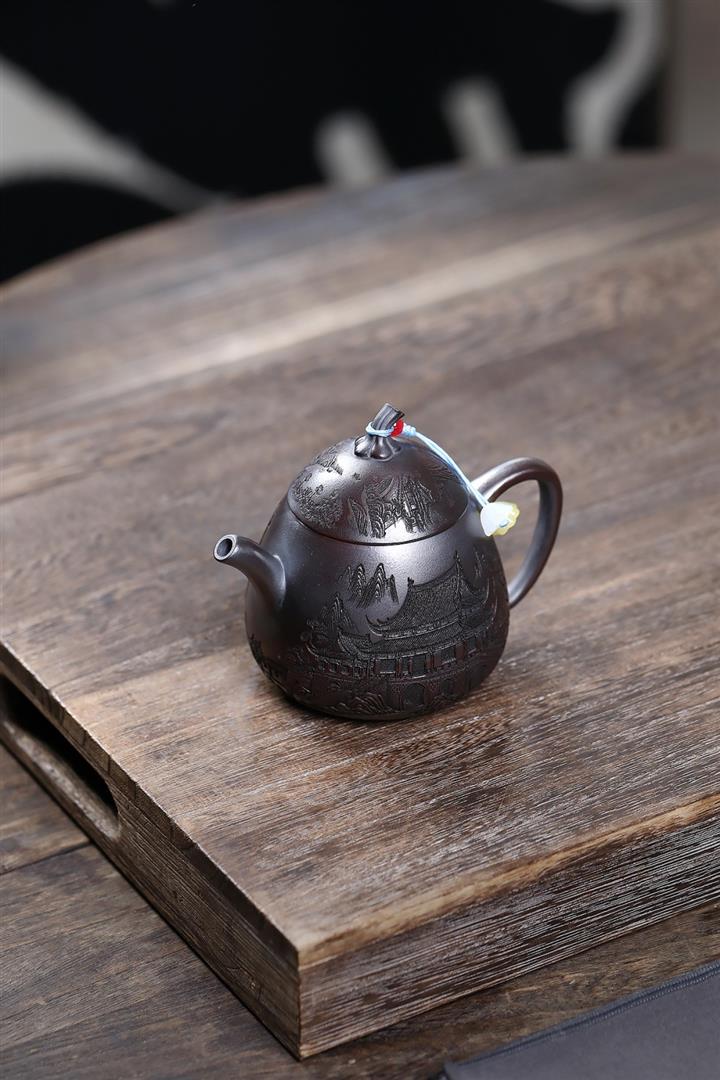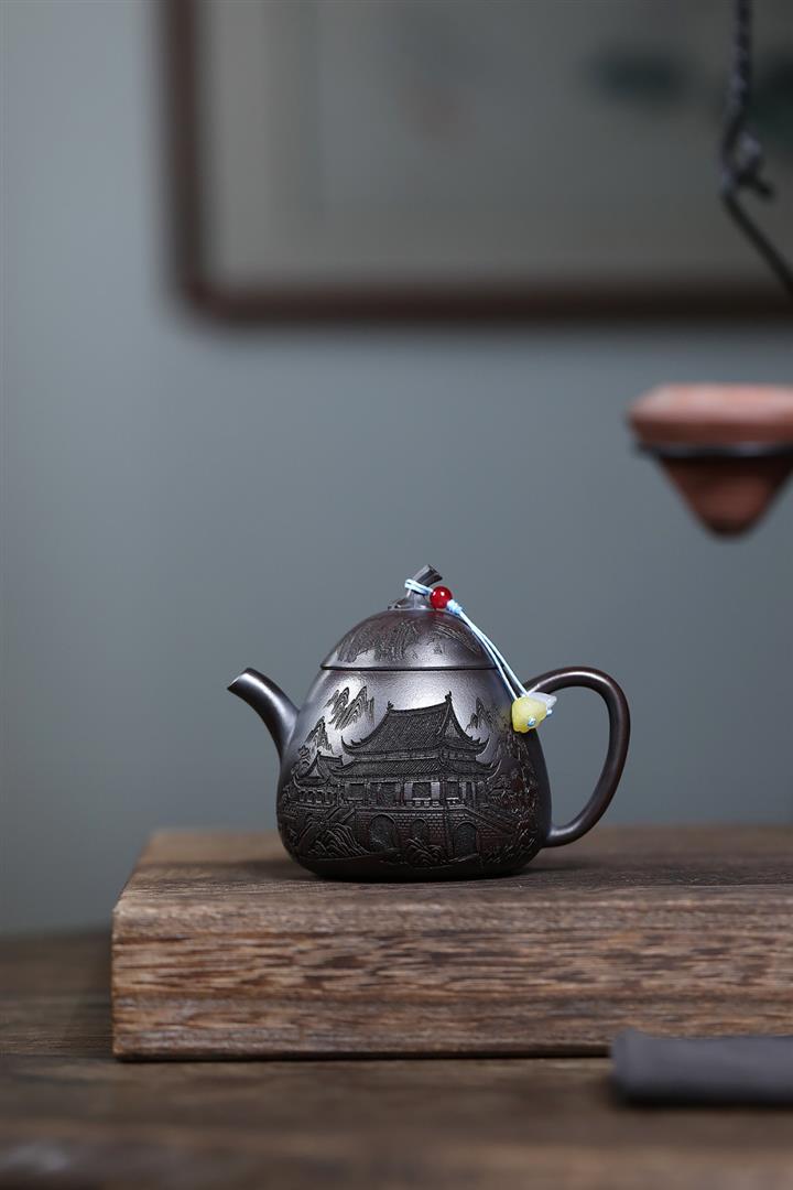 290cc玄鐵石黃黑料金刻龍馬精神茶壺POT8189