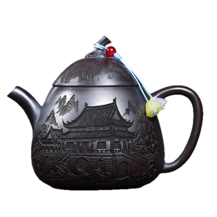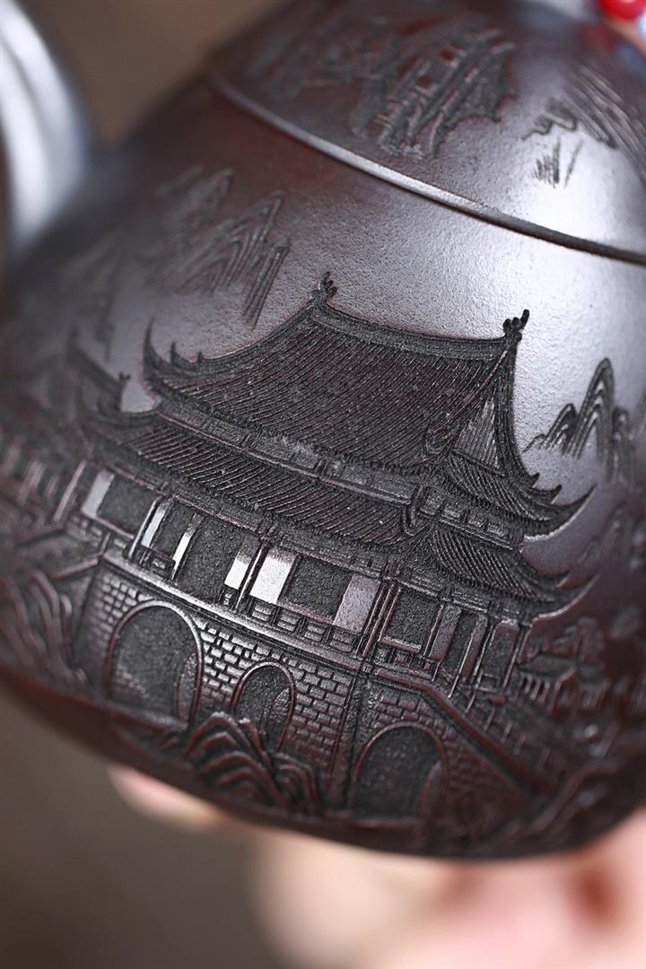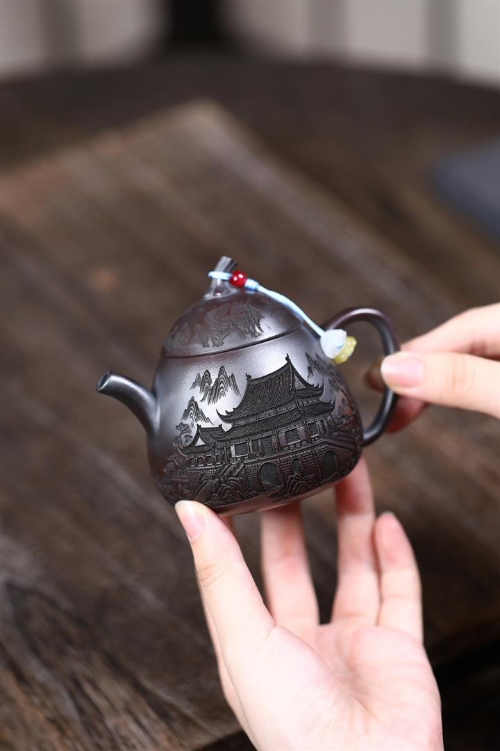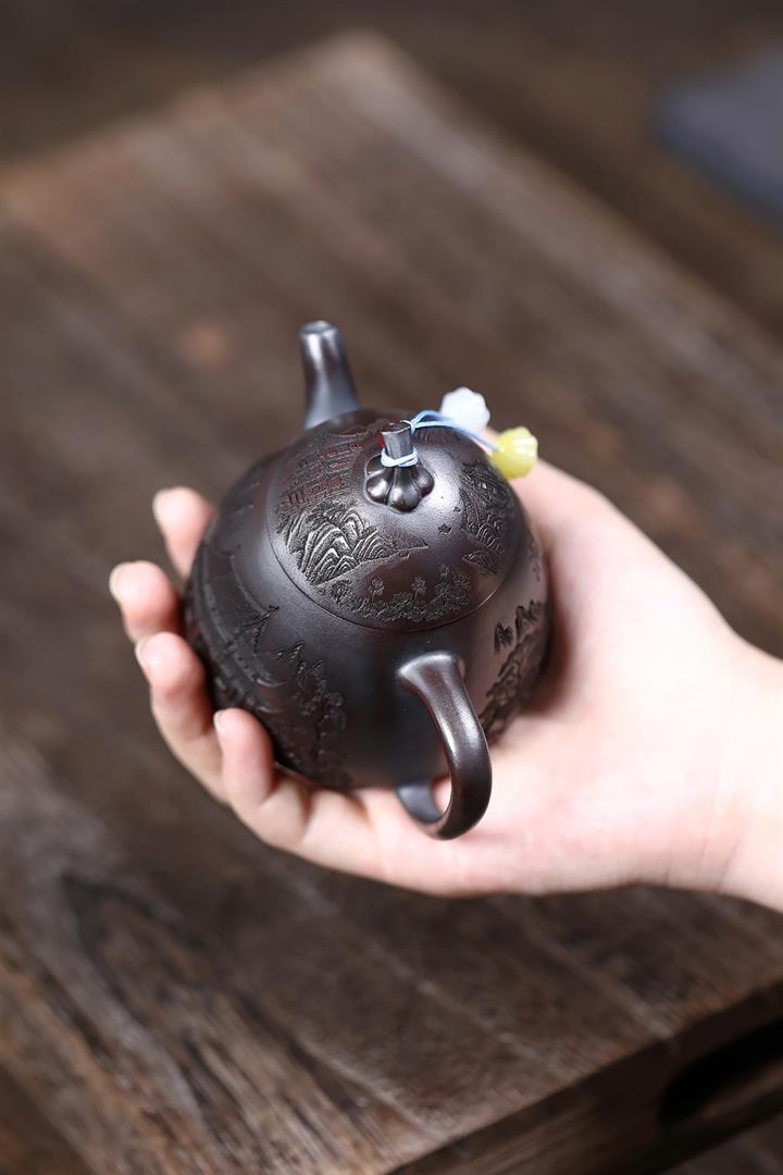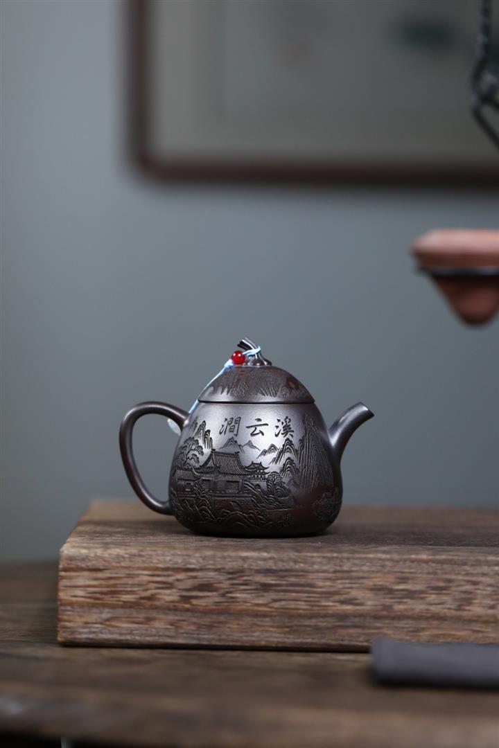 290cc玄鐵石黃黑料金刻龍馬精神茶壺POT8189
