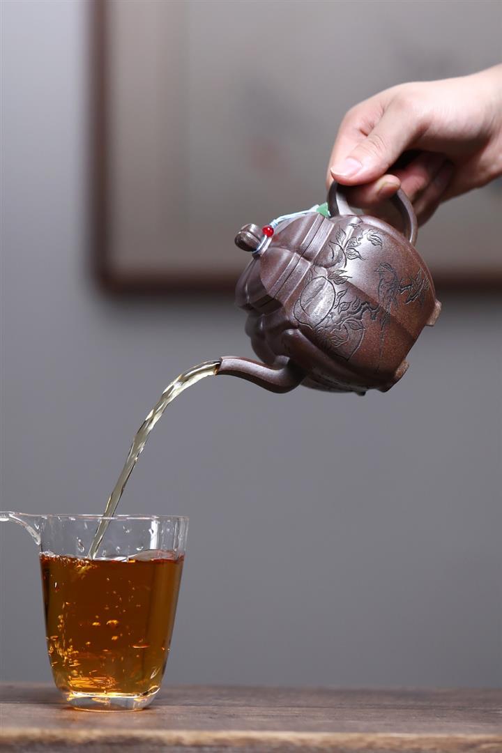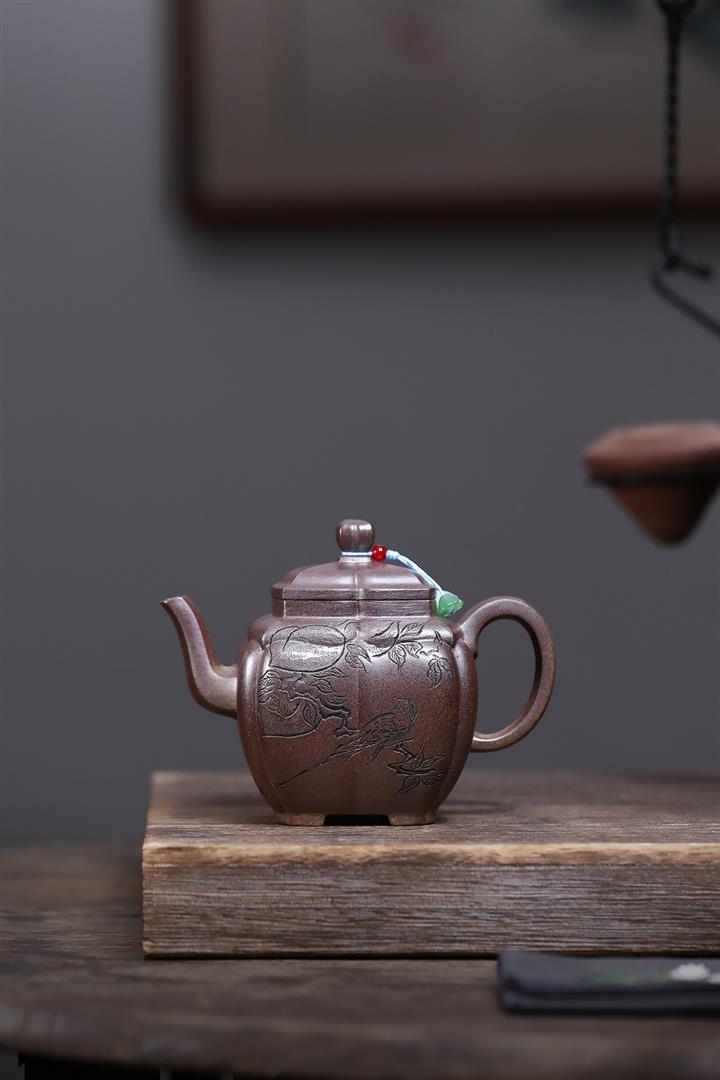 【泥料特點】砂土氣重,似淳實農民,日久使用,漸露鋒芒,養成變化,溫潤莊重。紫砂是壹種雙重氣孔結構的多孔性材質,氣孔微細,密度高。用紫砂壺沏茶,不失原味,且香不渙散,得茶之真香真味。紫砂使用越久,壺身色澤越發光亮照人,氣韻溫雅。紫砂壺長久使用器身會因撫摸擦拭,變得越發溫潤光澤。