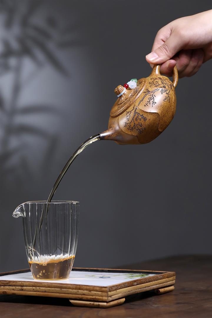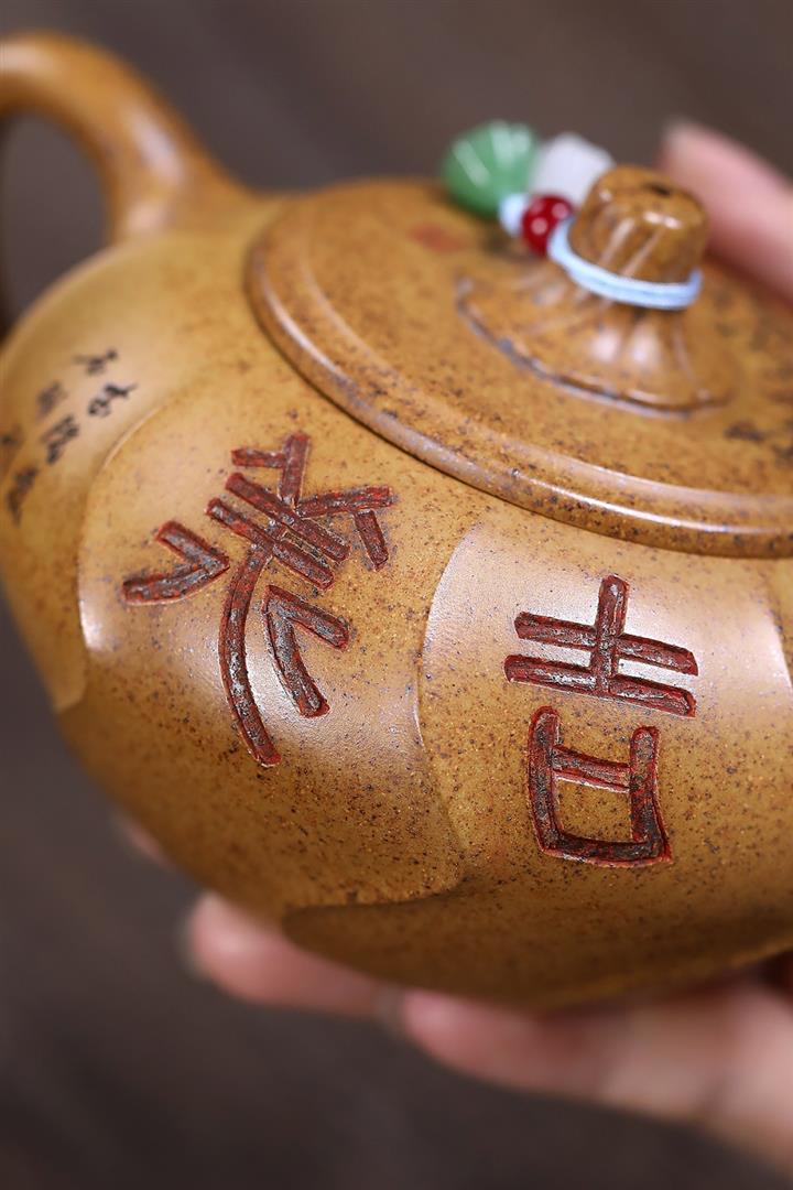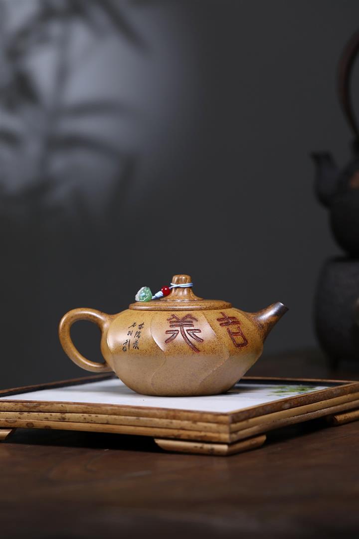 【泥料特點】砂土氣重,似淳實農民,日久使用,漸露鋒芒,養成變化,溫潤莊重。紫砂是壹種雙重氣孔結構的多孔性材質,氣孔微細,密度高。用紫砂壺沏茶,不失原味,且香不渙散,得茶之真香真味。紫砂使用越久,壺身色澤越發光亮照人,氣韻溫雅。紫砂壺長久使用器身會因撫摸擦拭,變得越發溫潤光澤。