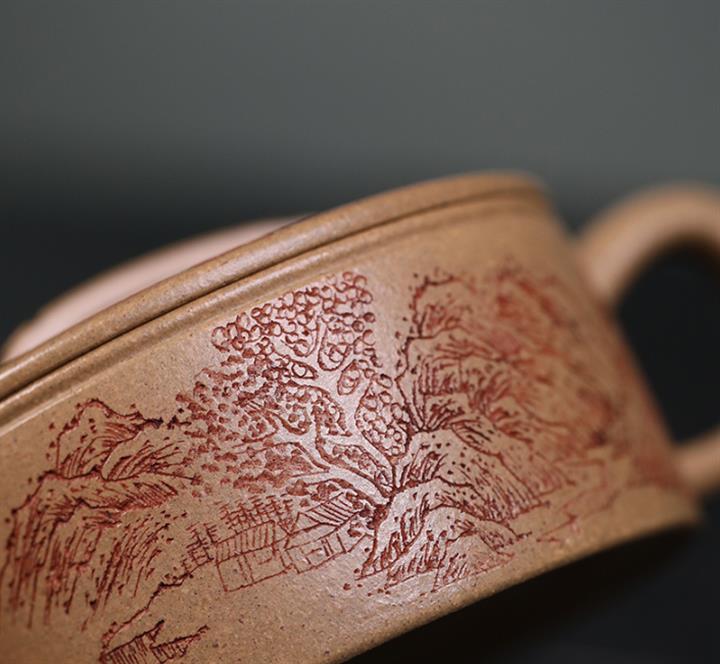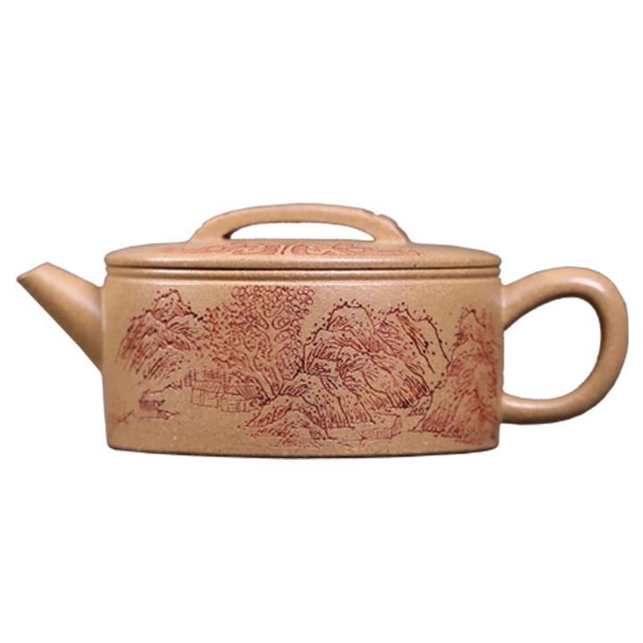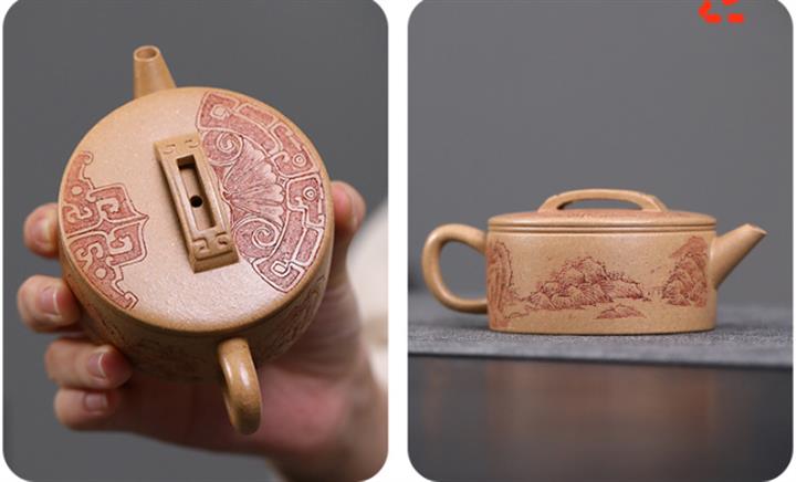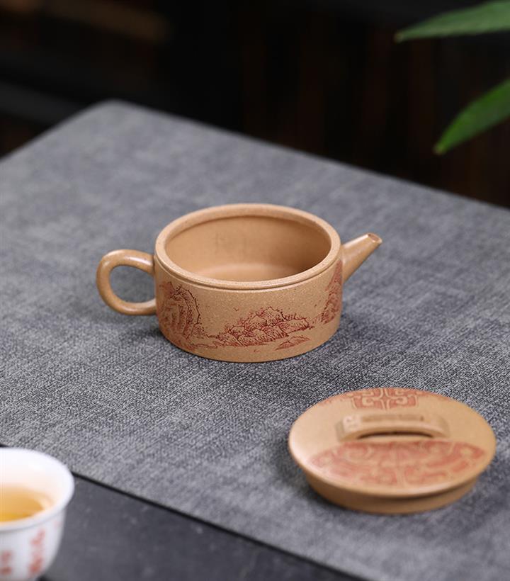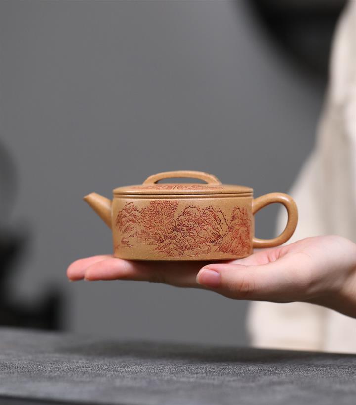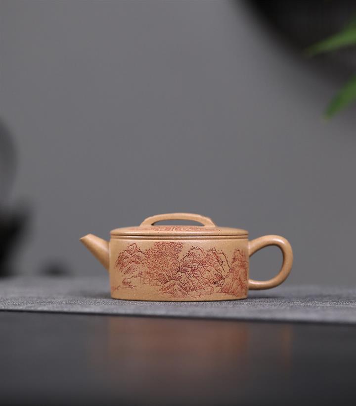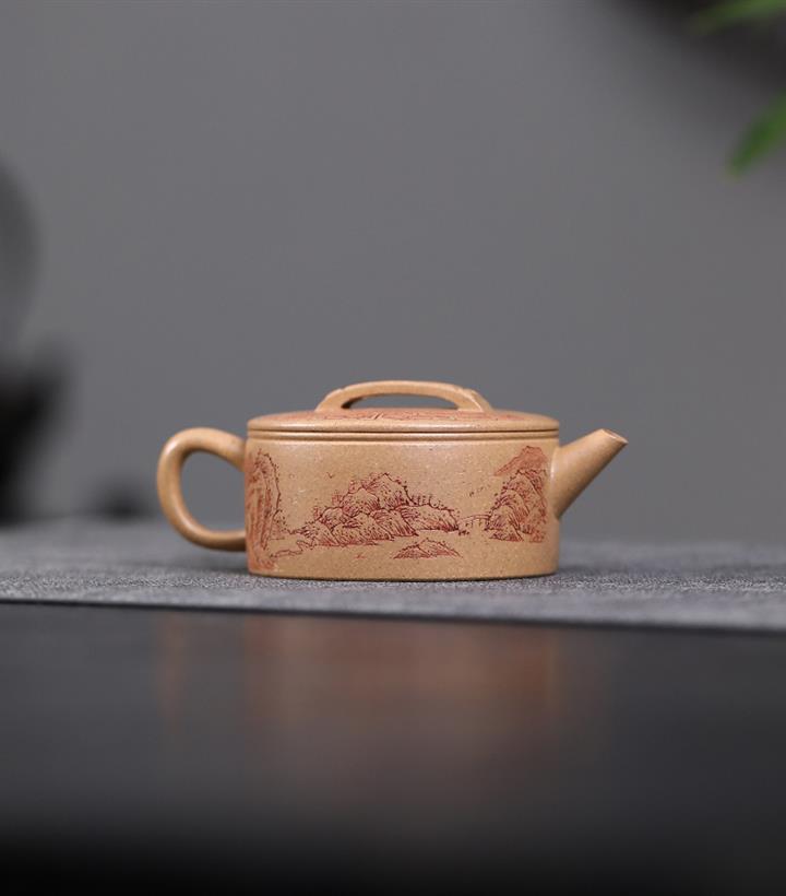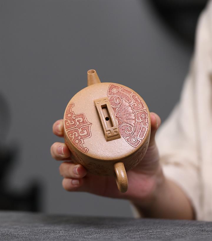200cc原礦石黃滿身刻繪虛扁扁晨茶壺POT8274