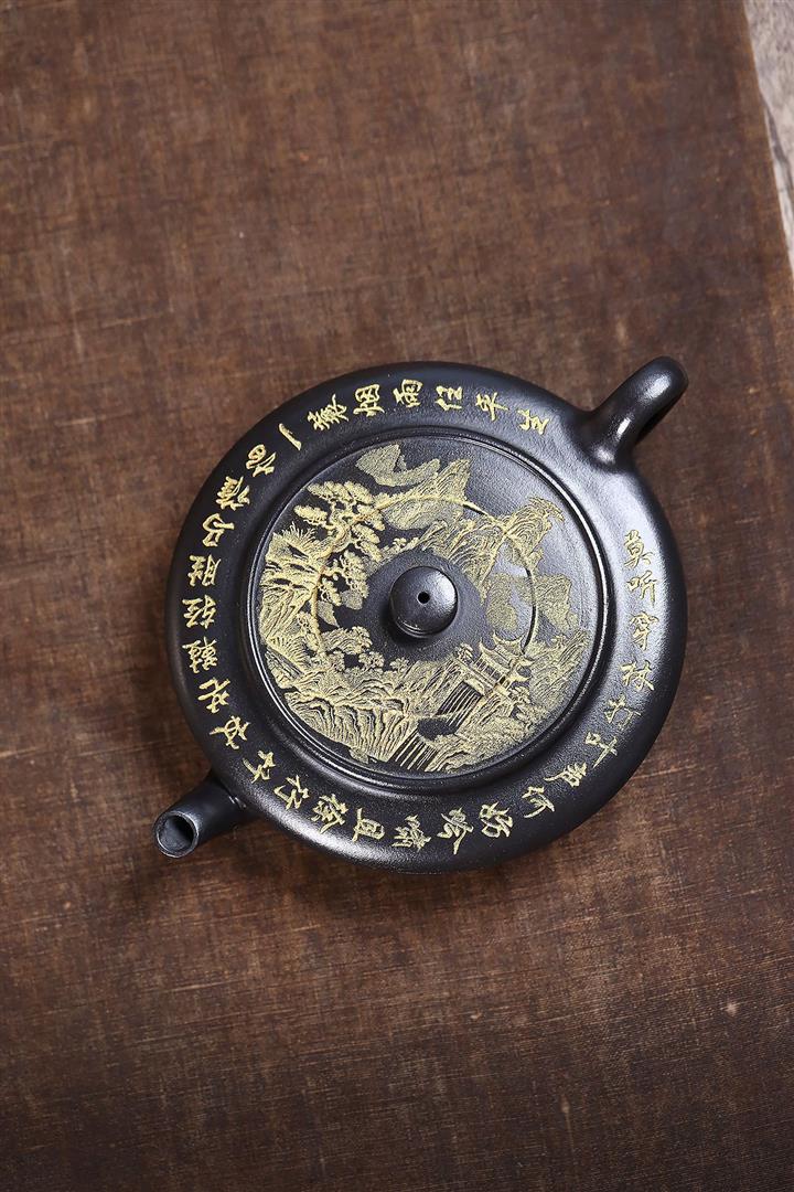 200cc原礦石黃滿身刻繪虛扁扁晨茶壺POT8274